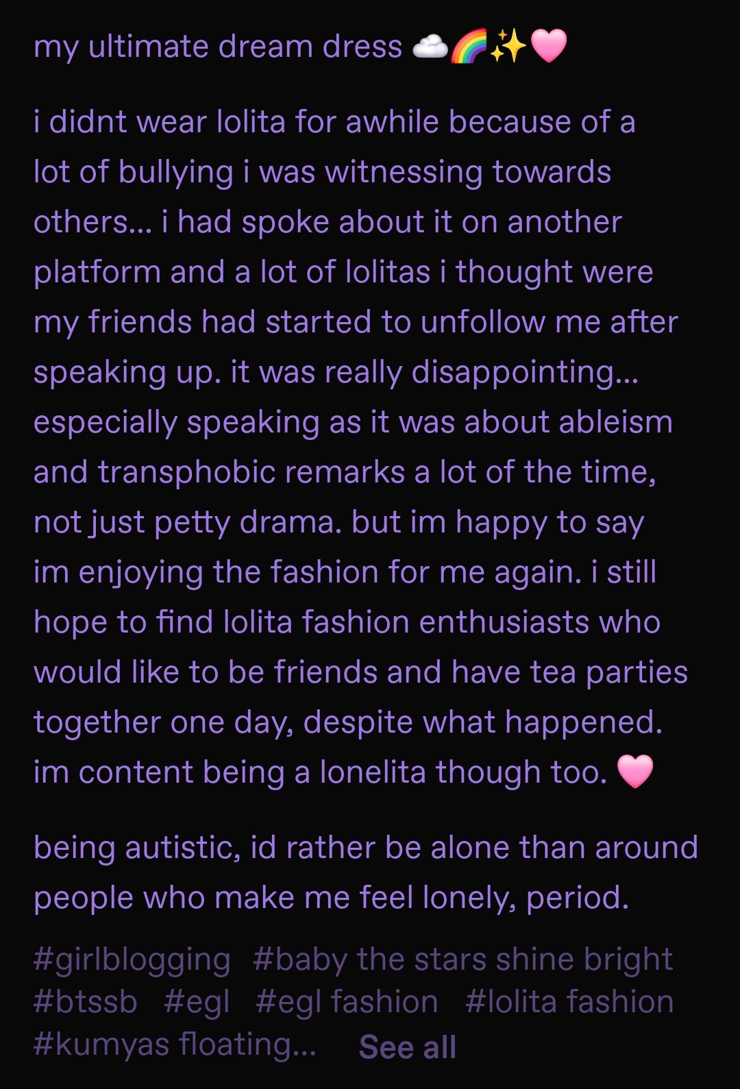 Been trying to convince my bf to take me to Lolita Collective physical store in Missouri, but he lives near St. Louis and I never learned how to drive.(ADHD and bad vision) So I just day dream about going there and never being able to ;-;