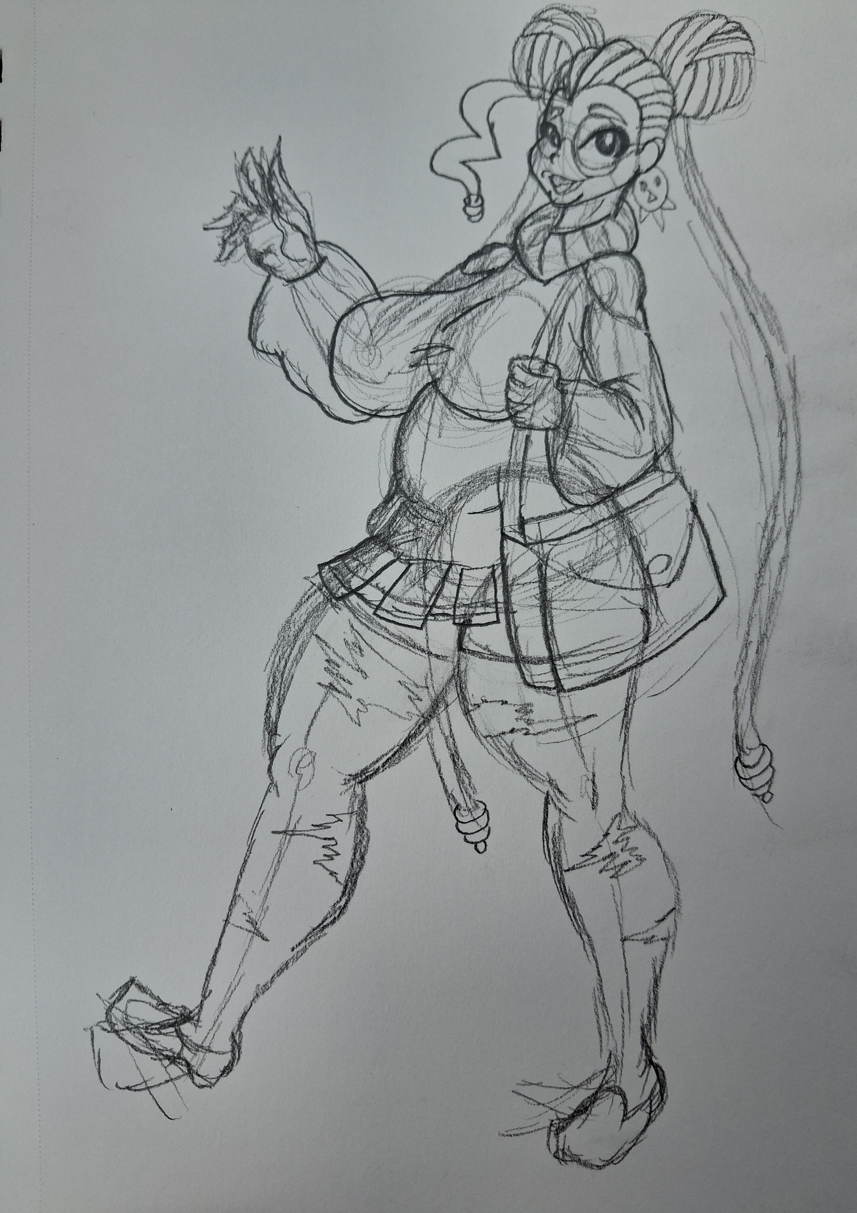 I plan on giving her freckles. I can make the skirt longer but I feel like that would cover the top of her leggings, as well as hiding her thighs. I'm still thinking about the color pallet, it will all depend on what skin color I think of. If I wanna make her a little gothy, her clothes will be dark, so I'll make her have a lighter skin tone. I think it'd be cool if she had a darker complextion but I dont know what colors could convey gothy that wouldnt just blend into her skin.