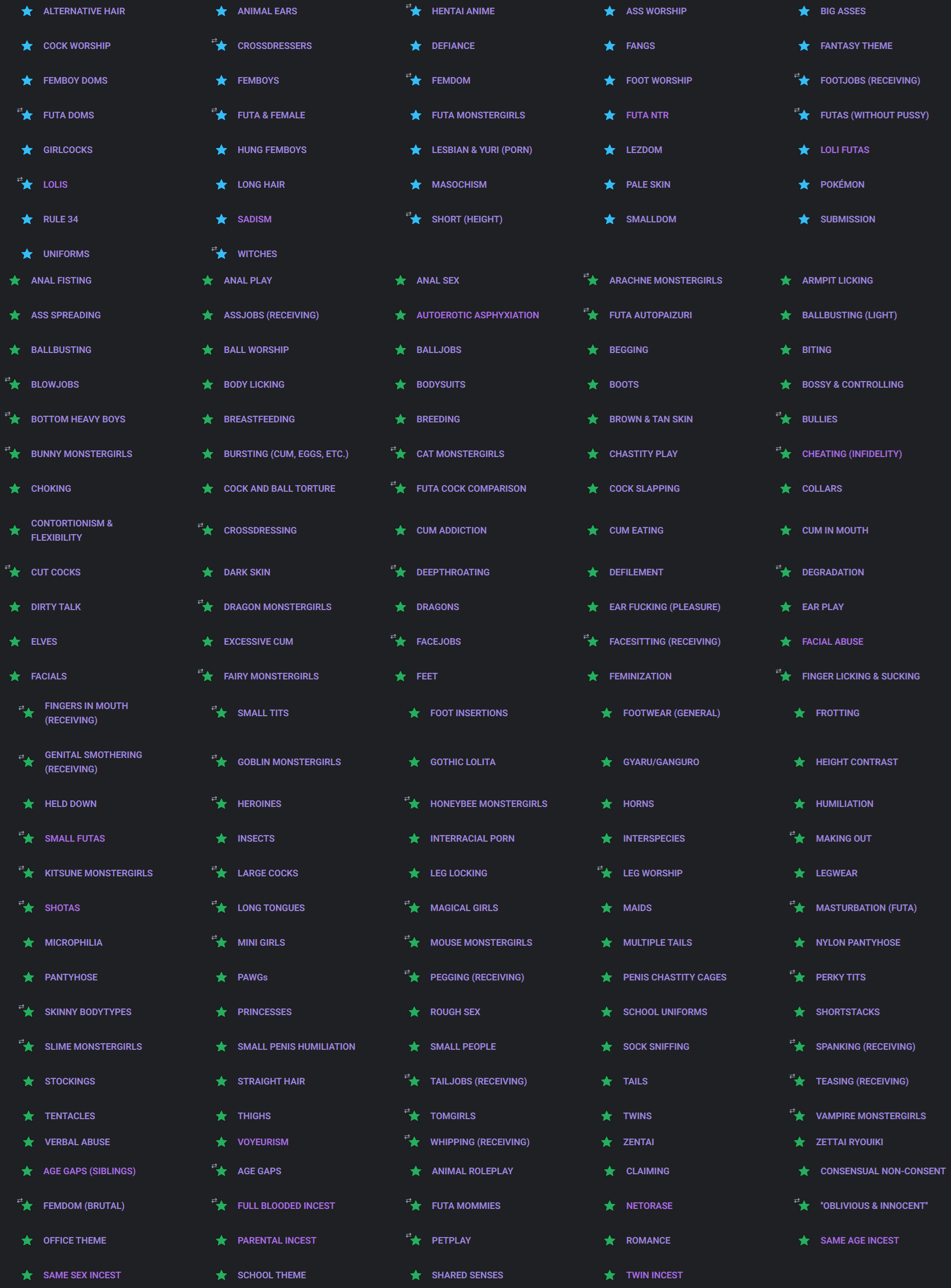How do I make it show all the fetishes? I don't want these broad categories. A good thing to add would be a button to simply "show all tags" on the results screen, right above the results. Or perhaps a "Show Categories/Show Tags" switch/dropdown.