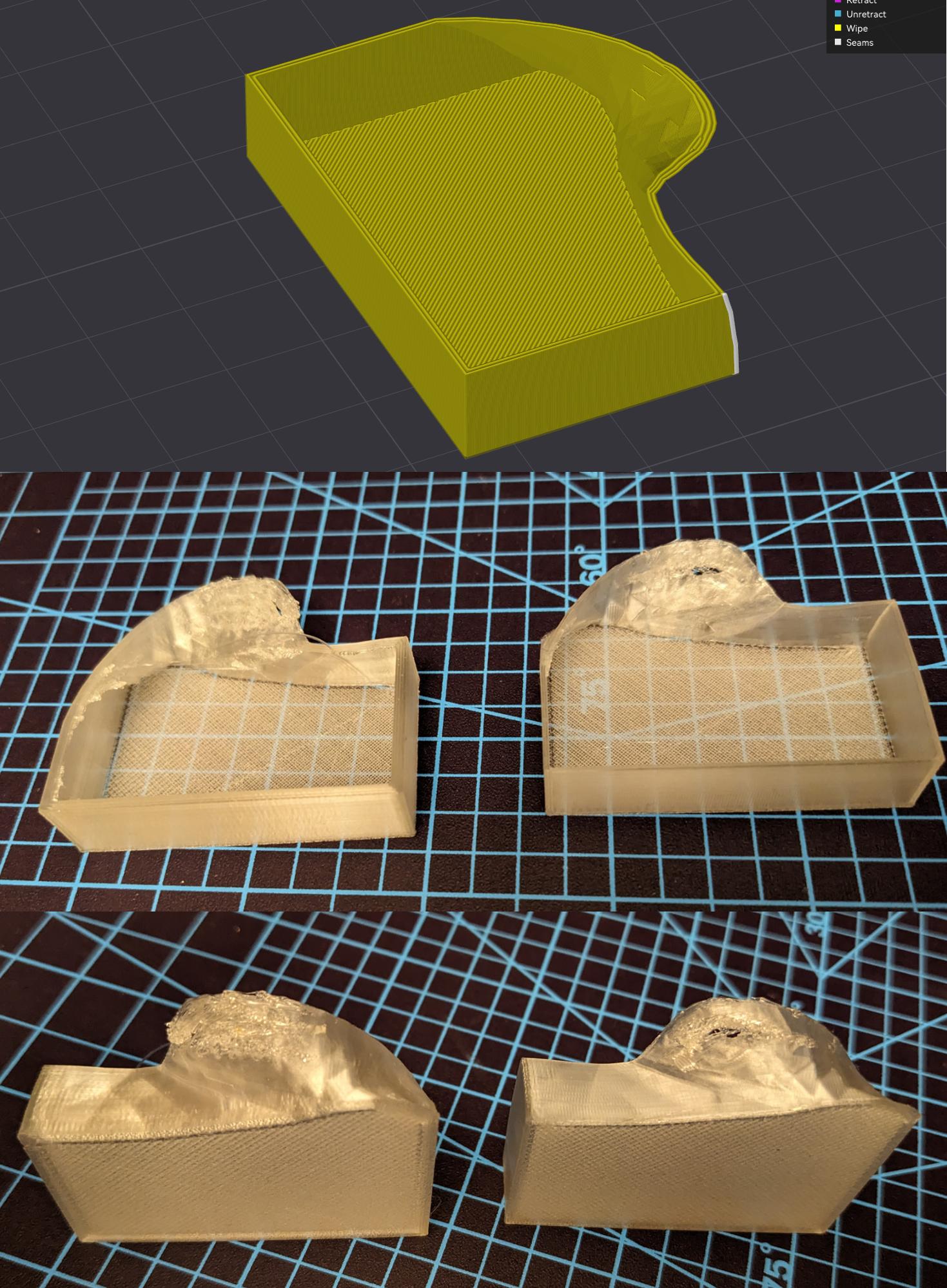 Can I get some TPU advice? TPU90, trying to print picrelated. It just goes awry at a specific point, in picrelated I have two attempts, one with 2 wall layers and one with 4. I'm using Bambu's TPU90A settings (on non Bambu TPU), I printed a benchy with it and it worked. The TPU has been dried for 10+ hours, and I'm printing it from a spool stand that minimizes the distance and bends between the spool and the path to the extruder.
