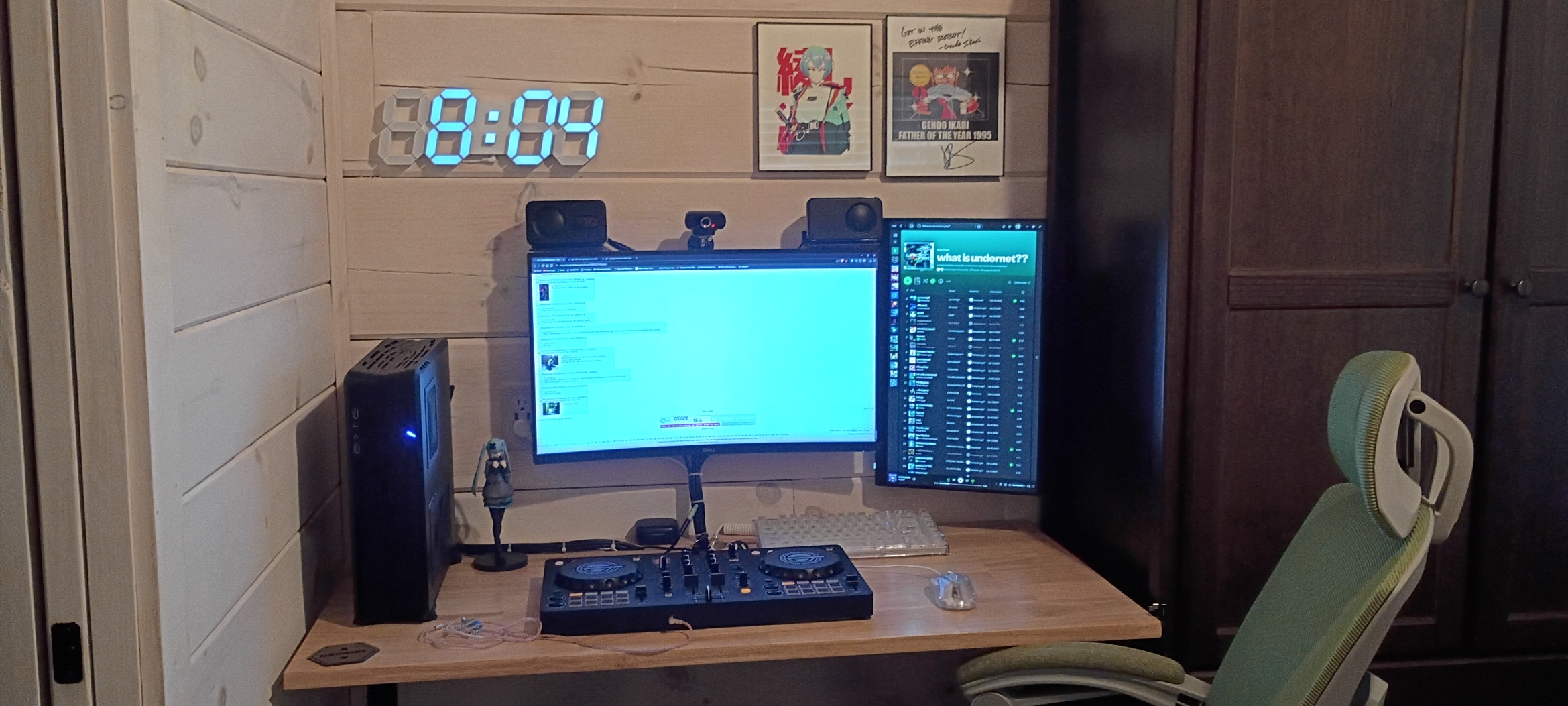 Kek. I always have some background noise when I'm working. I use the 2 horizontal screens for work, and the vertical one for personal stuff.
