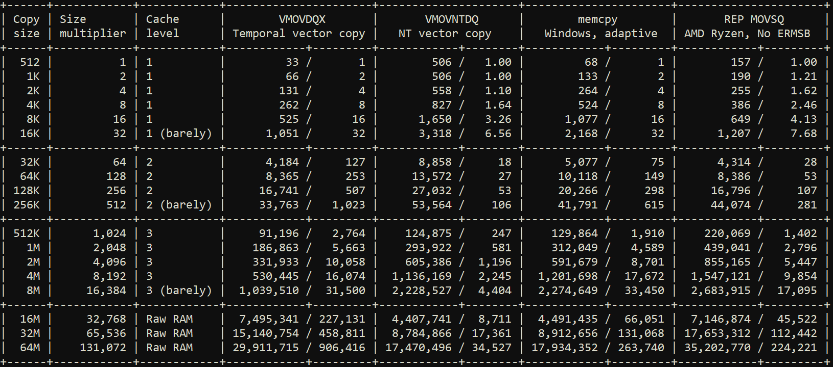 Or we could talk about the fact that, on Windows, memcpy will switch to NT stores at payloads higher than 512 KiB, or how they still use SSE instructions, or how it's a fucking crime interfaces cannot reveal information about their implementations (i.e. "don't worry, I'm not using SIMD instructions, you don't have to generate a fucking VZEROUPPER or preserve your own registers if you call me").