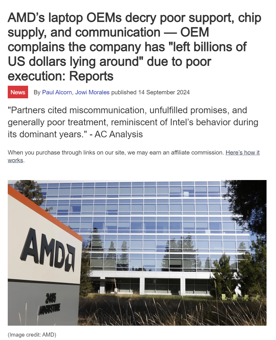 AMD has fallen into the same trap Intel did in its heyday. Literally all they have going for them is Ryzen. Their business acumen sucks, their GPU division is a joke. They’ve largely fumbled shift into laptop market even if the chips are actually good. Intel is slowly catching up and is even become a better value per dollar option. They are not Apple, who made great chips and support it with their own hardware and software. AMD just has one money maker and is slowly getting challenged from all sides.