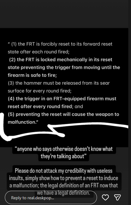 I'm seeing a lot of this in the FRT world. I asked AS Designs at SHOT show about handgun FRT's and everyone at the booth said "fuck no" in unison. they then went on a talk about the rarebreed settlement, even though nobody but rare breed agreed to the settlement. idk what their lawyers tell them.
