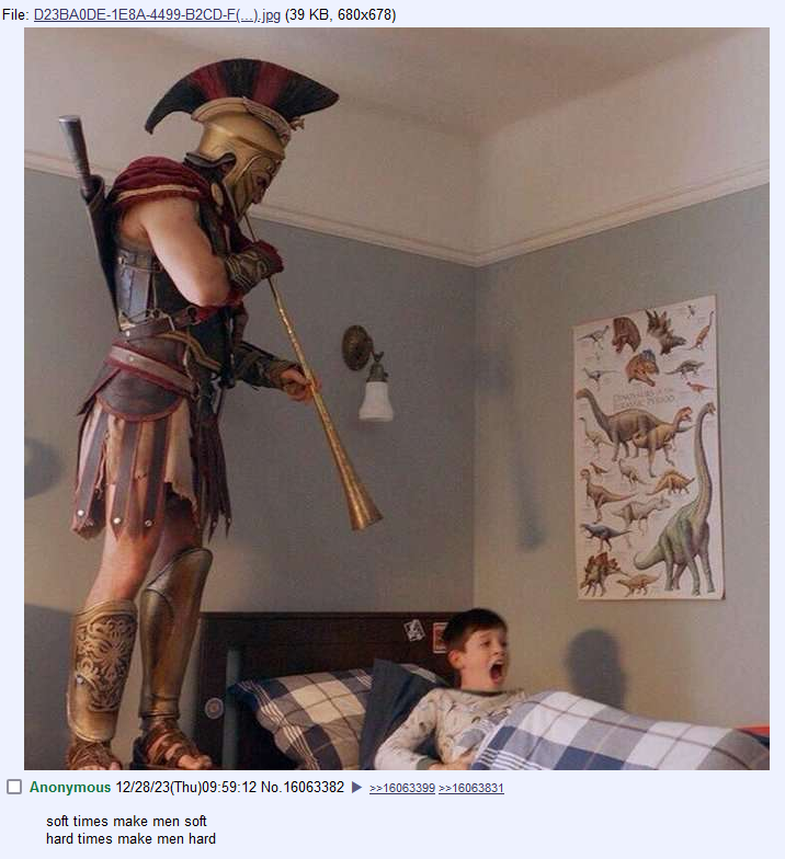 Also I do believe that in this article in that image, he takes issue with the "hard times = hard men" phrase, which is about individual prowess and willpower, and pretends to misunderstand it and and turn it into an issue about civilizations. One of his examples is about the latter Roman Empire - you know, that one that relied heavily on foreign mercenaries instead of recruiting from its natives. He ignores that the armies of many societies recruit primarily from the most impoverished strata of society. He ignores that even in societies of warrior castes (e.g. the nobles of medieval Europe) it were the most impoverished members of that caste who primarily did the fighting.