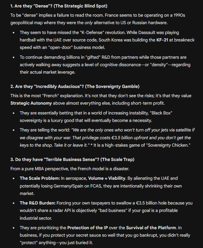 And really both countries "know" this is a dead program, but neither side can politically stomach being the one "responsible" for killing a €100B joint European defense program. So instead they'll both just pretend it's going fine for the next several years before killing everything and Germany is "forced" to buy more F-35s.