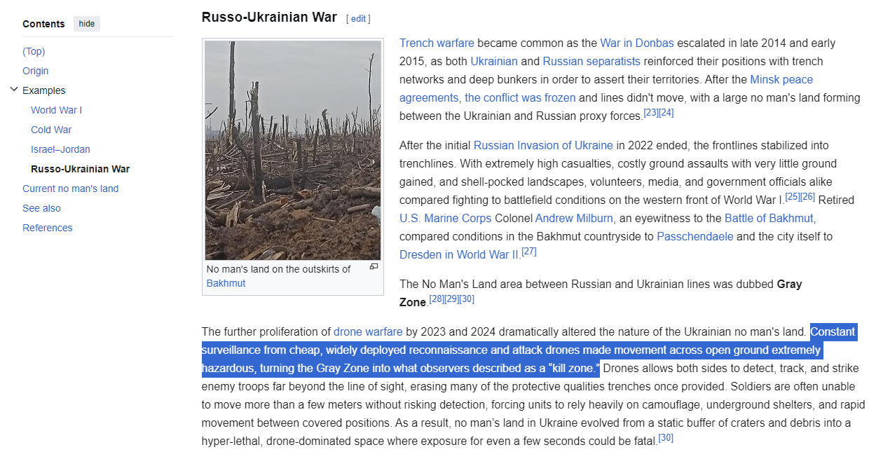 Trench warfare is obsolete. The frontline is now 15km wide gray zone with drone operators in hidden dugouts monitoring the entire front