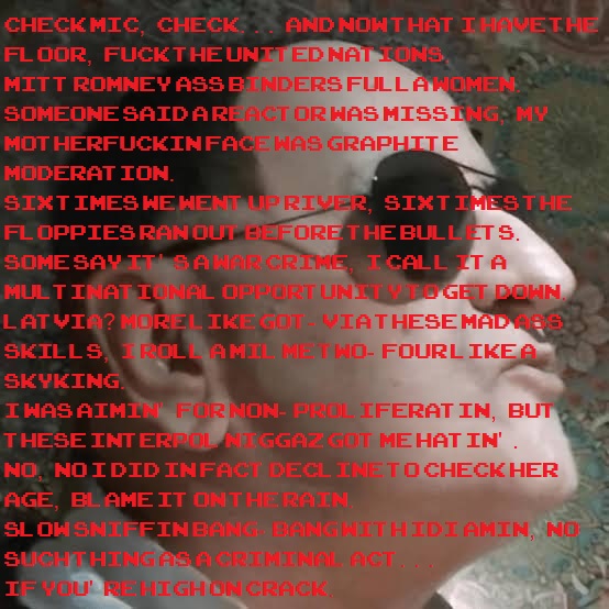 >We smokin' IMR. We smokin' Cordite. We smokin' Torpex. We smokin' that Calabrese salame Za Za kush that had Cadorna goin' 12 times. I run more .38 Special than a daycare for middle-age retards. I use more phosgene than Ludendorff at a rave. Take daily blood transfusions from Aimo Koivunin. Went blind from the pervitin and still out-shot Simo Häyhä. Bought out the whole Varusteleka warehouse for the hell of it; now I'm outfitting mercenaries on both sides. Choked out my ops with a single-point sling; buried them in Anzio with a cask of Amaretto. I'm throwin' cash around like US MIC. Huffin' that shit that put Corporal Hitler in the hospital. I stretched her wider than the Fulda Gap; ran through her like an armored column. Get more head than Van Owen and Roland combined. Did three tours in Somalia for shits and giggles; the war crimes are the only thing that gives life meaning. Pissin' Coffee Instant Type 2 and shittin' out Pain Hamburger. Hit that kosmoline and everything went red; woke up in Suomussalmi: aw man, I did it again. This shit returns to port under its own power.