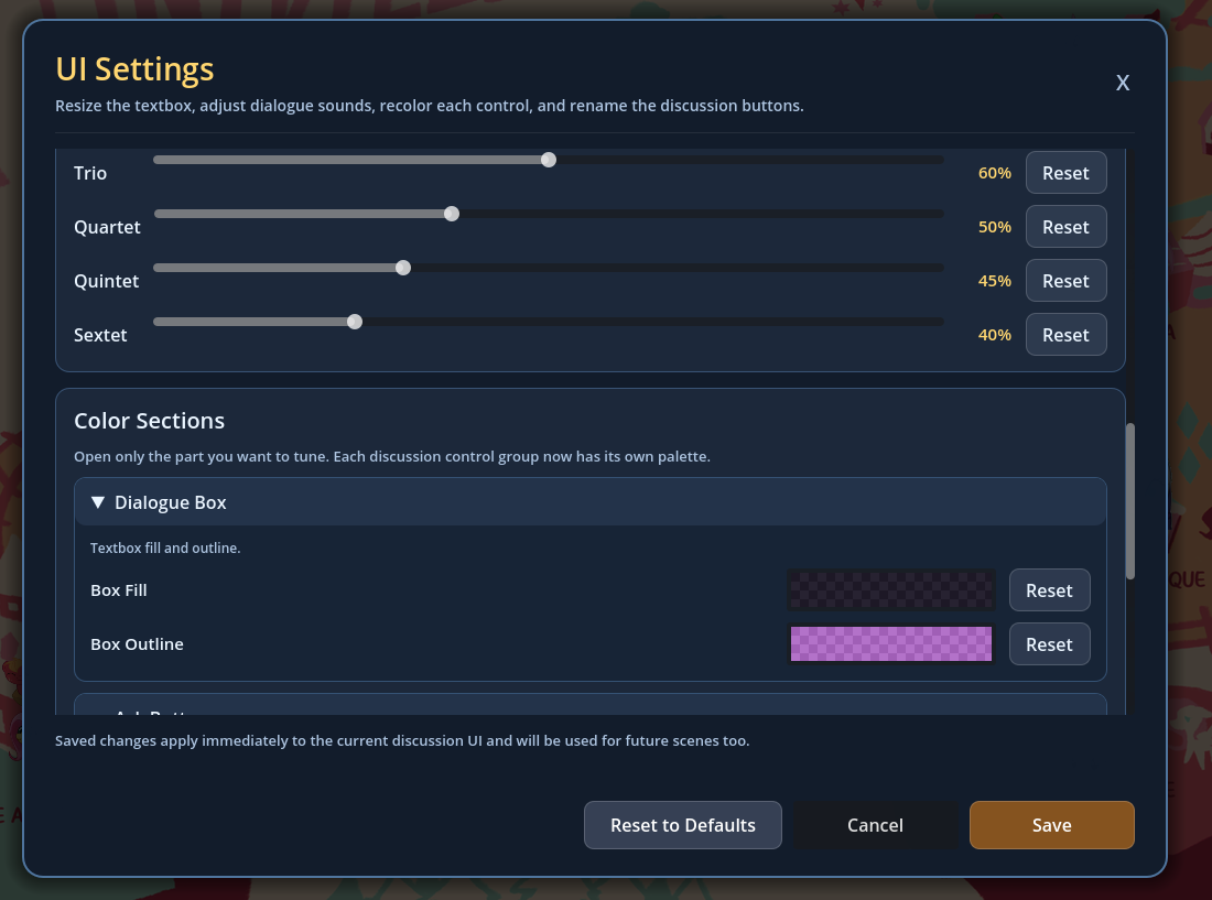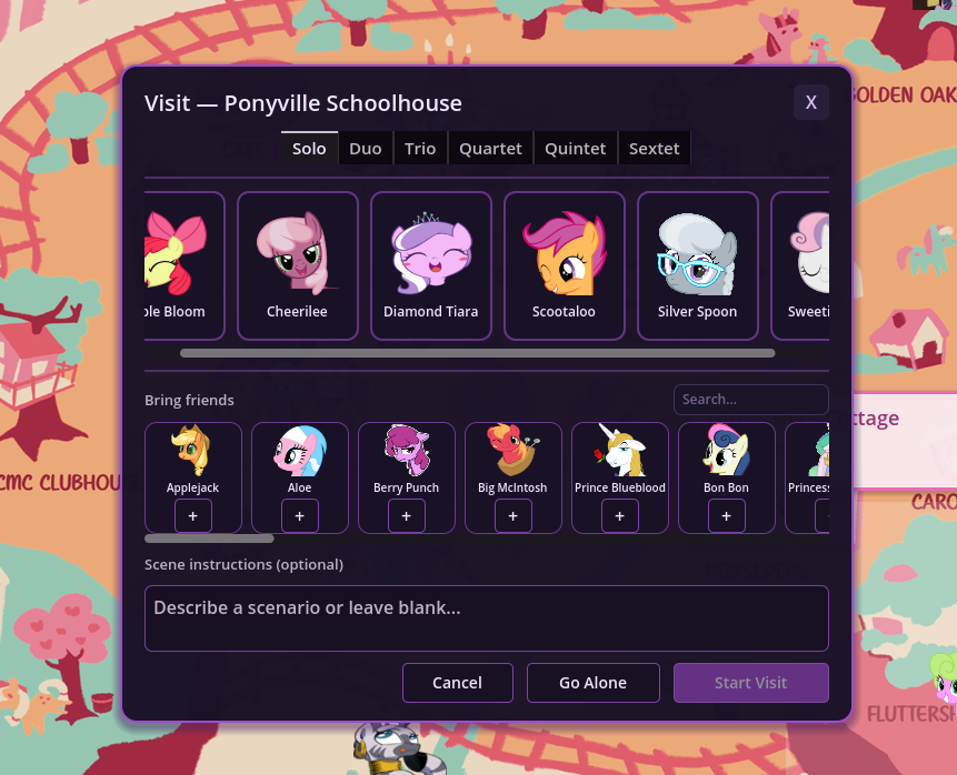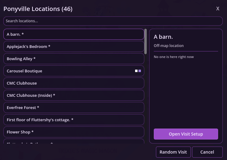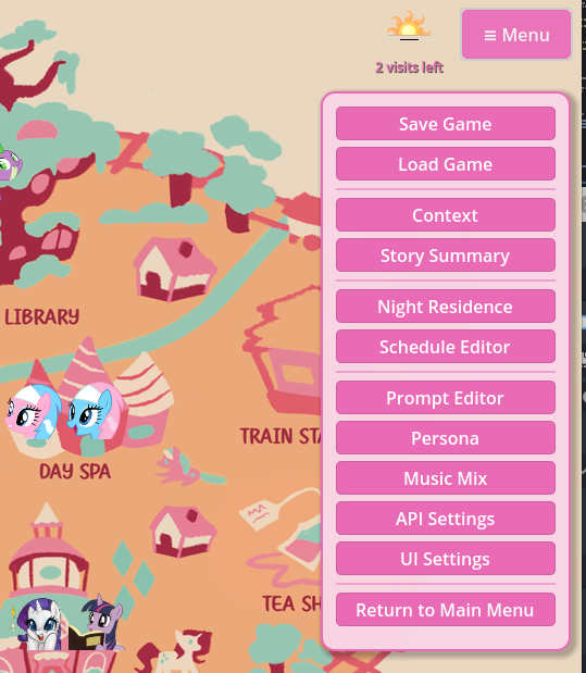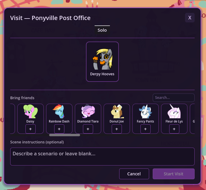 I posted an autisticly detailed suggestion on the scrumboy for the VN. The basic idea is that it would be cool to be able to save your custom visit setups and re-use them later or share them with other Anons. It's motivation to spend more time crafting scene setups and quick starts if you knew you could jump right back in future to try them with different models and ai advancements.
