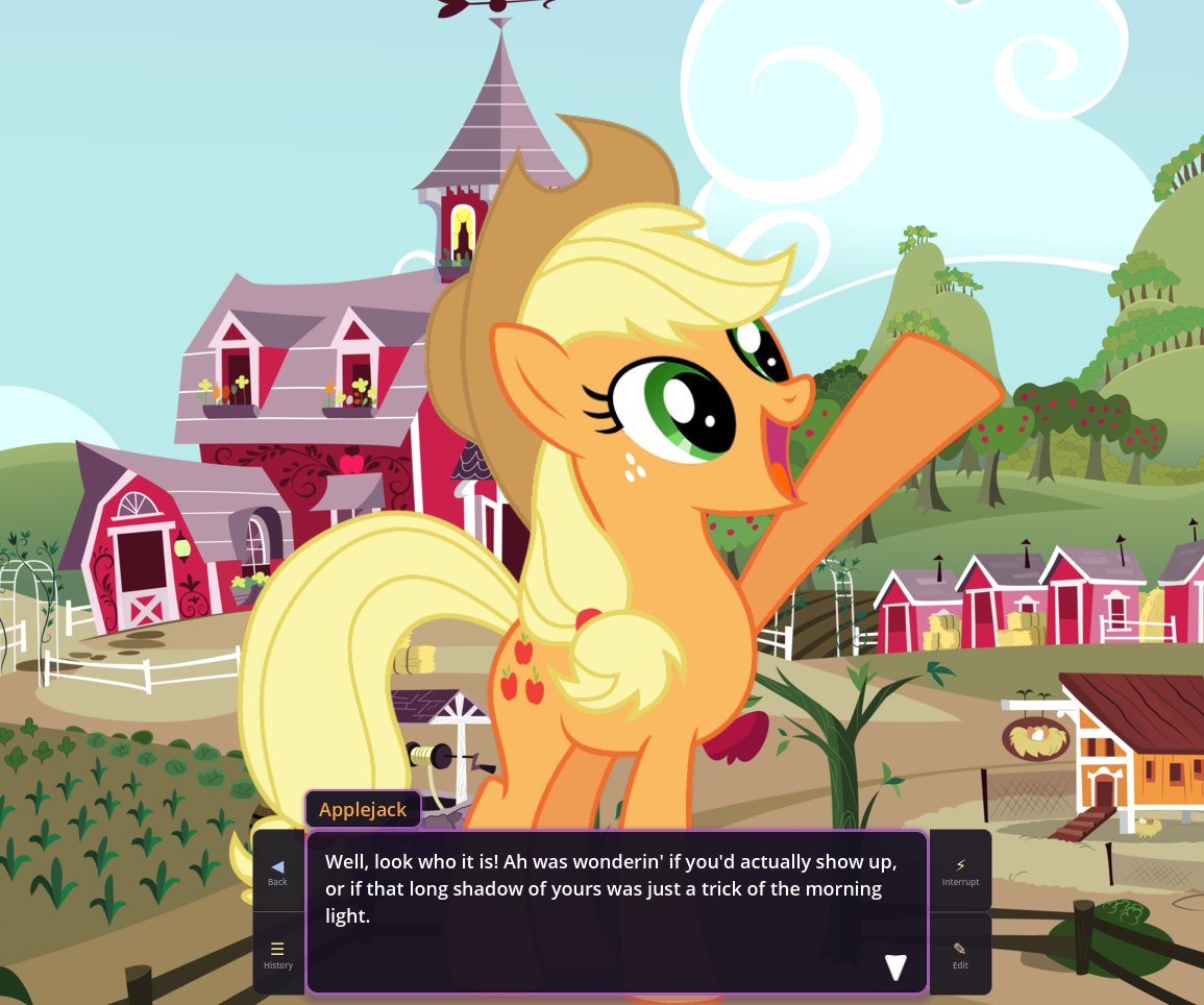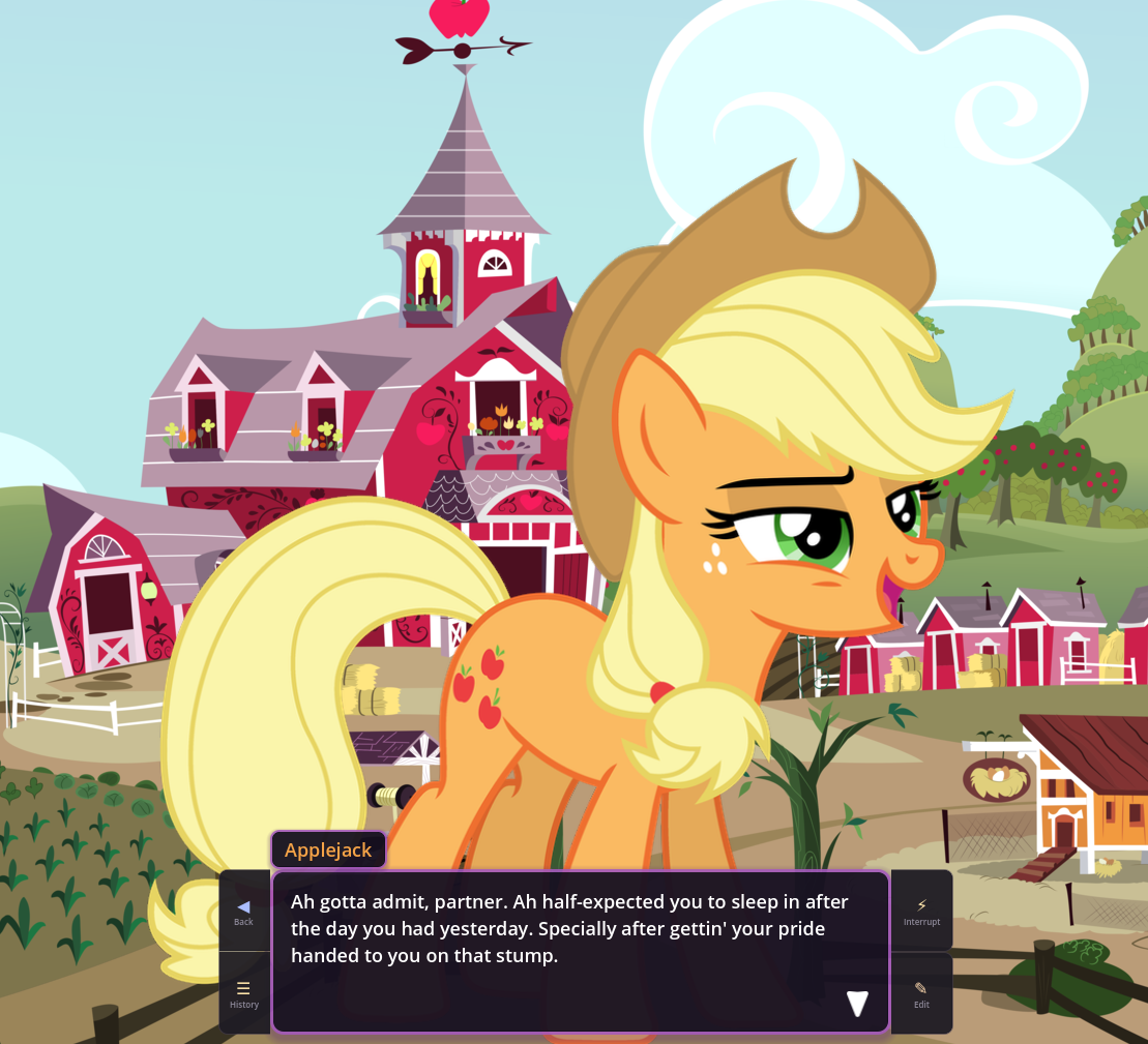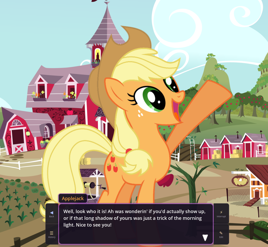 In fact, in EquestrAI, I've enjoyed going back and forth between interpretations of things sometimes just because it's so novel and fun. Sometimes loud shitposter Pinkie is what you really want for a comedic scene, and sometimes the empathetic sunshiny baker girl Ponk is what you want for a more "realistic" scene instead. I'm a huge boomer so my understanding of Equestria is 99% based on Season 1 and 2, but you can easily incorporate as much as you want from later seasons too. It's very very fun, and pony, both as a concept and a fandom, is built upon the foundations of connecting with your inner child and just embracing playing. You don't use toys to do it, but whether it's fanfics, music, playing AI shit, or whatever, we're still ultimately giving into the playability of the franchise and just having fun. Something I'm very grateful for.