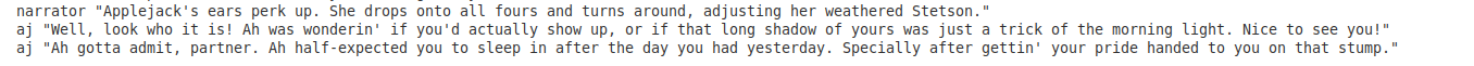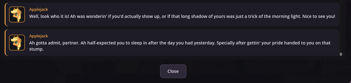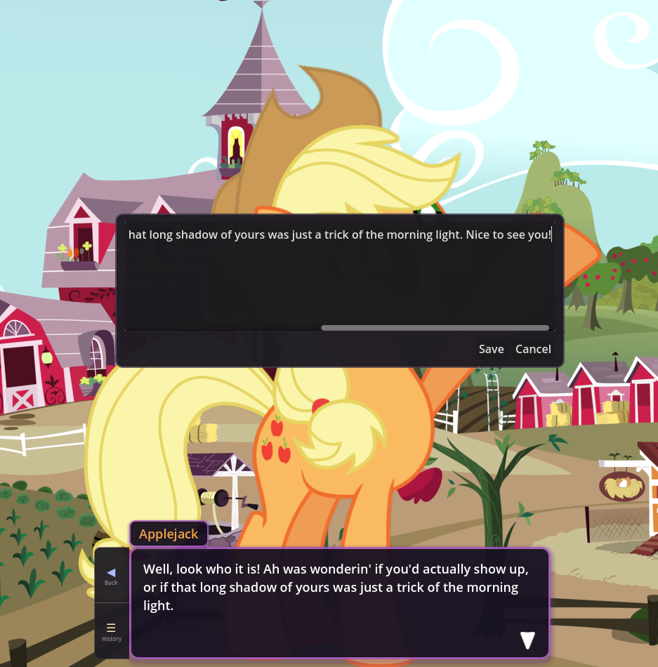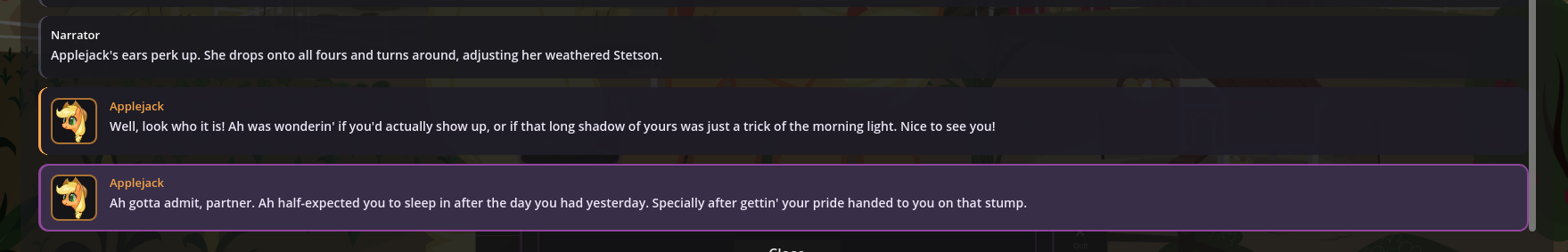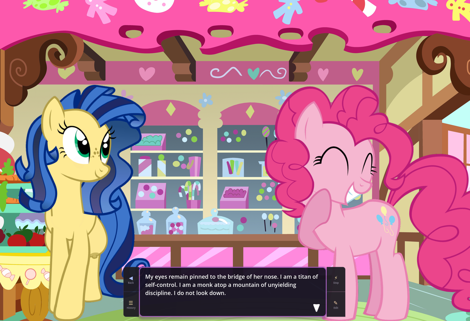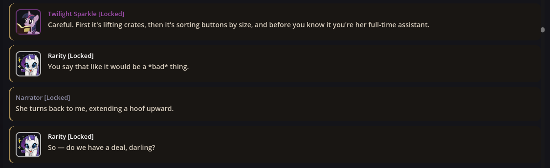 In fact, in EquestrAI, I've enjoyed going back and forth between interpretations of things sometimes just because it's so novel and fun. Sometimes loud shitposter Pinkie is what you really want for a comedic scene, and sometimes the empathetic sunshiny baker girl Ponk is what you want for a more "realistic" scene instead. I'm a huge boomer so my understanding of Equestria is 99% based on Season 1 and 2, but you can easily incorporate as much as you want from later seasons too. It's very very fun, and pony, both as a concept and a fandom, is built upon the foundations of connecting with your inner child and just embracing playing. You don't use toys to do it, but whether it's fanfics, music, playing AI shit, or whatever, we're still ultimately giving into the playability of the franchise and just having fun. Something I'm very grateful for.