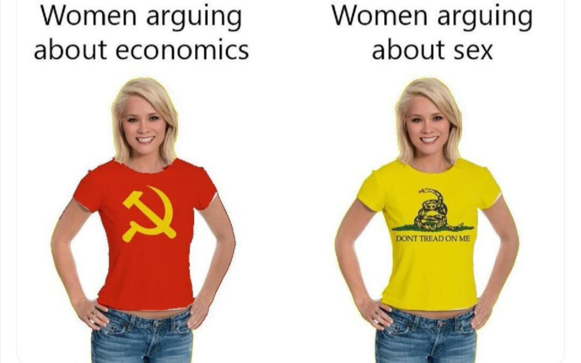 Needs a third shirt with facism on it for when they're arguing defense. When it's time for men to work and die, women are very happy to have big government telling people what to do with their bodies against their will. But, when it's time to reproduce? Suddenly they're ancap and fuck the government and you don't owe anyone anything, and bodies are sacred and mustn't be forced to labor against their will.