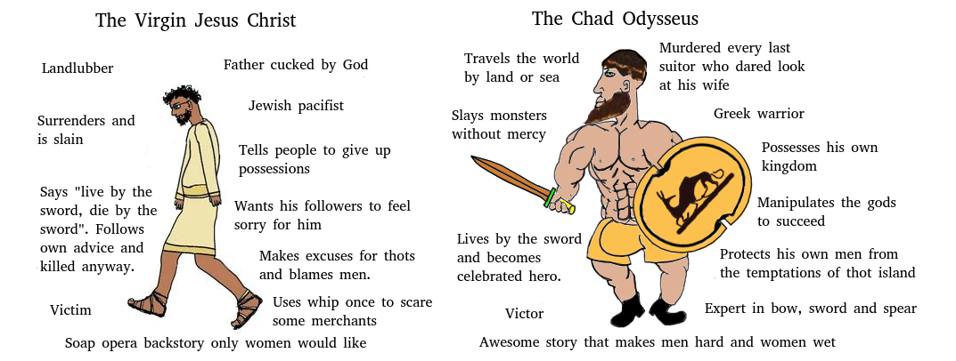We don’t believe in then like the christcuck does in a superstitious fashion. We know that we can not always conceptualize the divine so we make use of symbols and what we have here in this limited 3d world. The Gods are not humans but that is the only way we can describe them here while in material reality. What christianity did was replace rational thought with superstition which is detrimental to the psyche of any race.