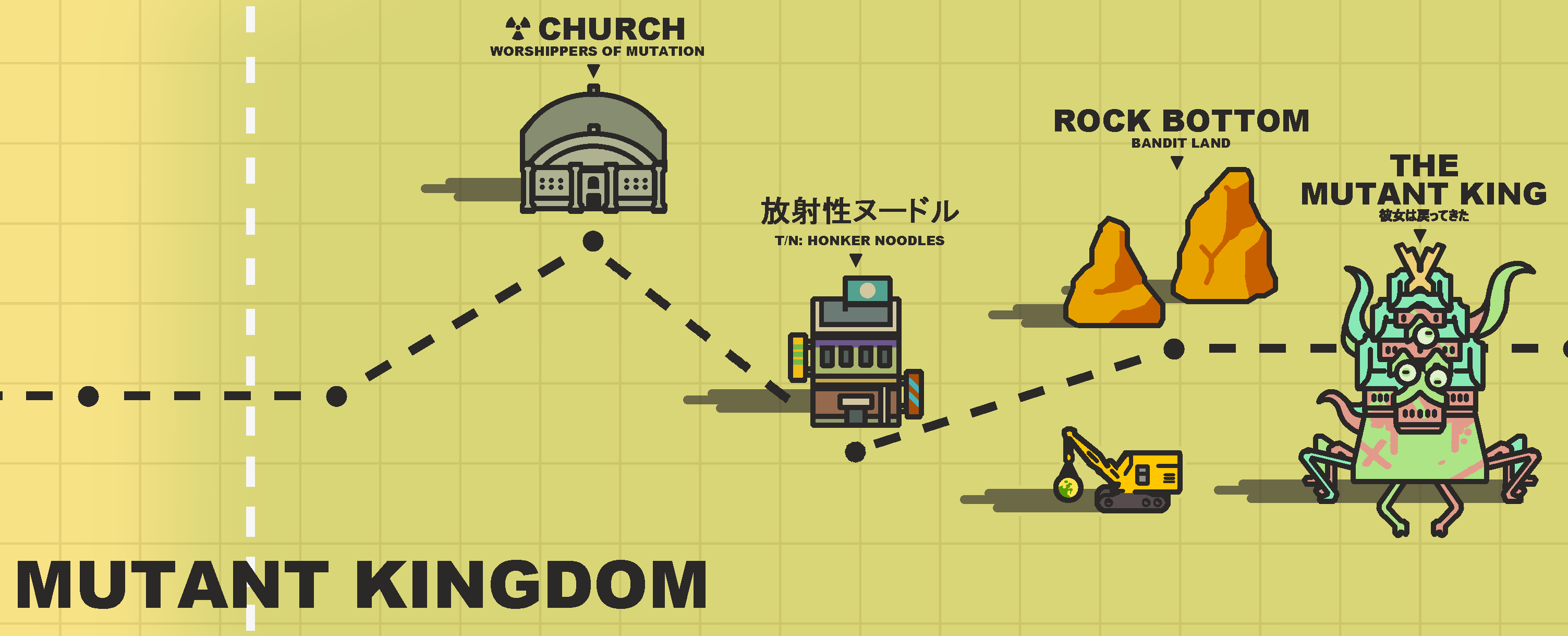 “The MUTANT KING.. the MUTANT KING earned its crown by might and might alone. Not because it’s a ruler. Not because it built a kingdom. That “king” is the only thing in the wasteland to have challenged the WASTELAND KING in combat and survived.” He spits on the ground. “It earned a spot of land east of here. The MUTANT KINGDOM. A shithole of killers and thieves–all the detritus wash up on its shores. The only ones who choose to live there are the crazy, the stupid, and the ones with no where else to turn. And the fast food selection is garbage. We're talking some bottom of the barrel Chinese food.”