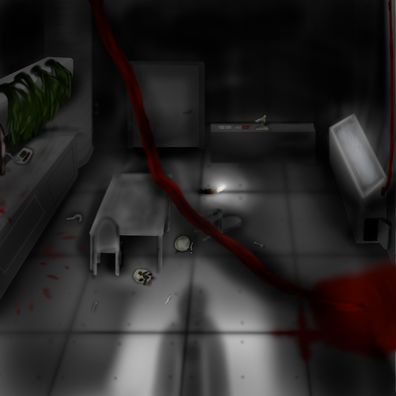 A huge vein lies draped across a table and onto the floor, bleeding into a corner.