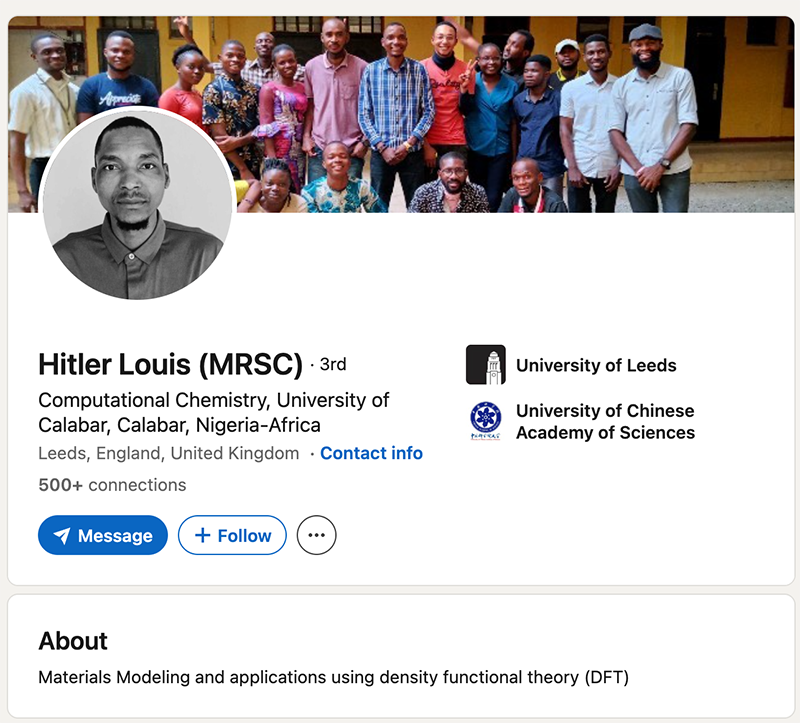 Until recently, his LinkedIn page named him as a Ph.D. student in computational chemistry at the University of Leeds in the United Kingdom
