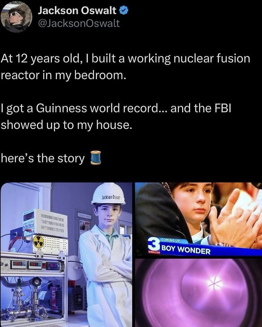 A Farnsworth-Hirsch fusor is stupidly simple to build. All you need is rich parents, internet access, and at least a 100 IQ. I wanted to make one when I was his age, only reason I couldn’t was my dad said no to dumping $2k+ on essentially a cool glowy toy.