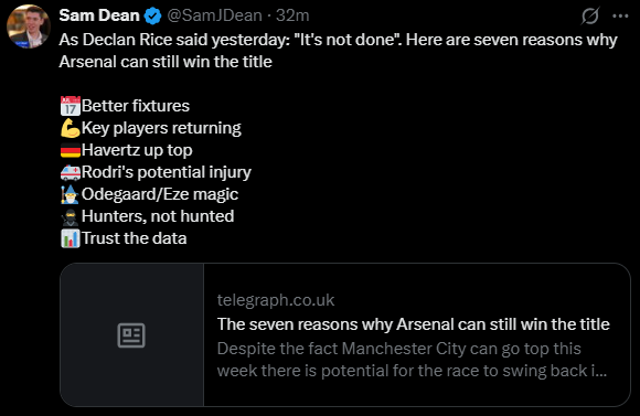 It's like an F1 pitstop. We've had our late season pitstop. Nice and fast, fresh tyres and a top up of the tank. City are finishing on worn scorching mediums. Ours for the taking still. And we have less games to go so less opportunity to slip. 4 games now. That is all.