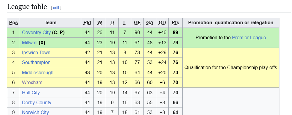 >Millwall are finishing third (and losing the play-off final to Southampton)