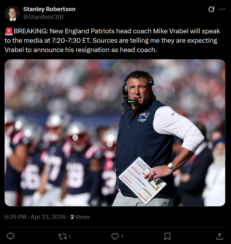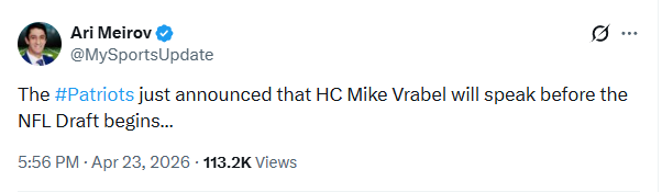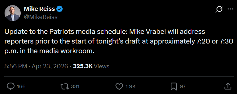 >[Daniels] Mike Vrabel is scheduled to speak to the media tonight if the Patriots make a pick. In the event they trade out, Eliot Wolf is scheduled to talk Friday and then on Saturday with Ryan Cowden. So, if the Patriots trade out, Vrabel isn't on the media schedule until 5/27.
