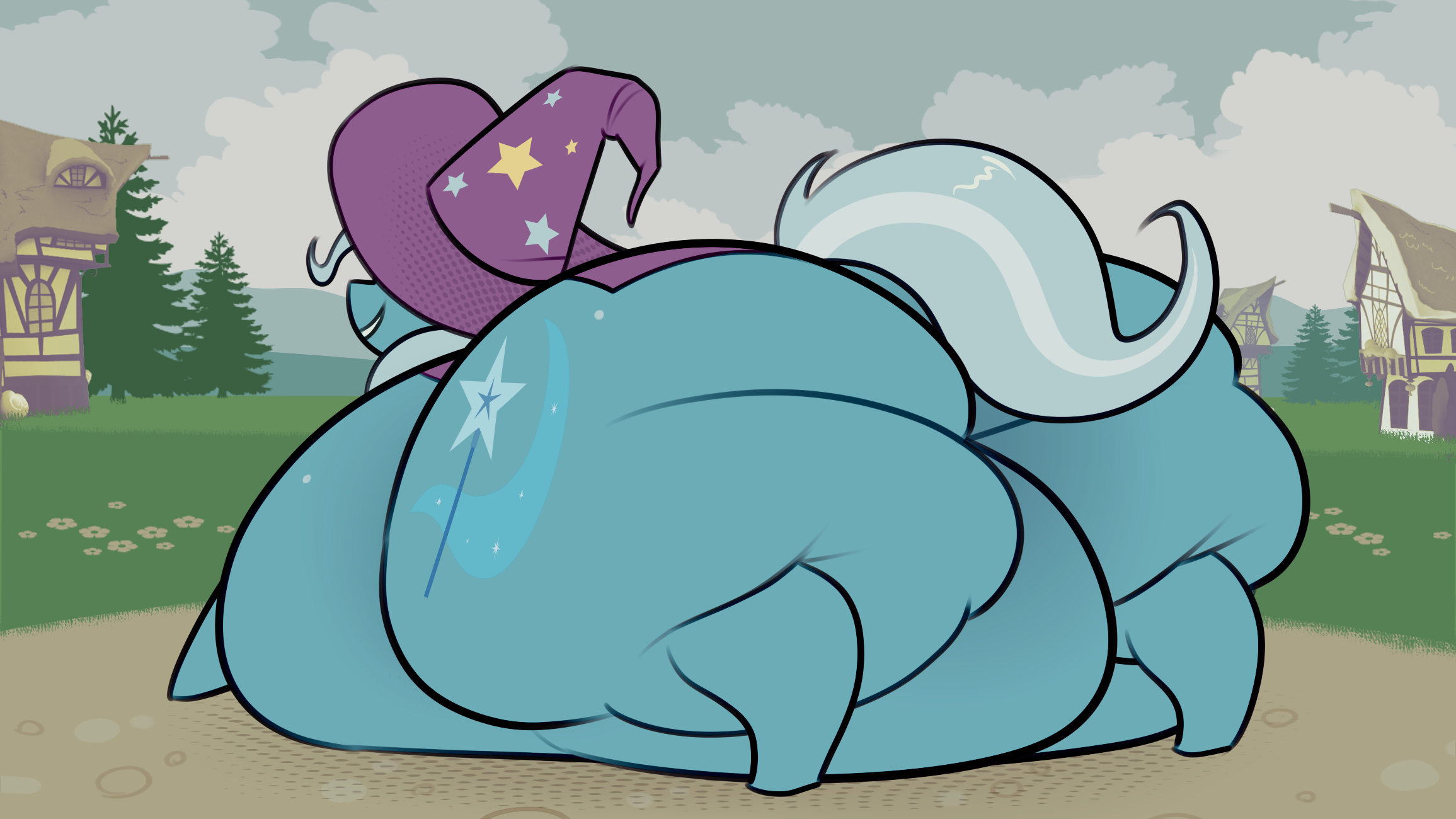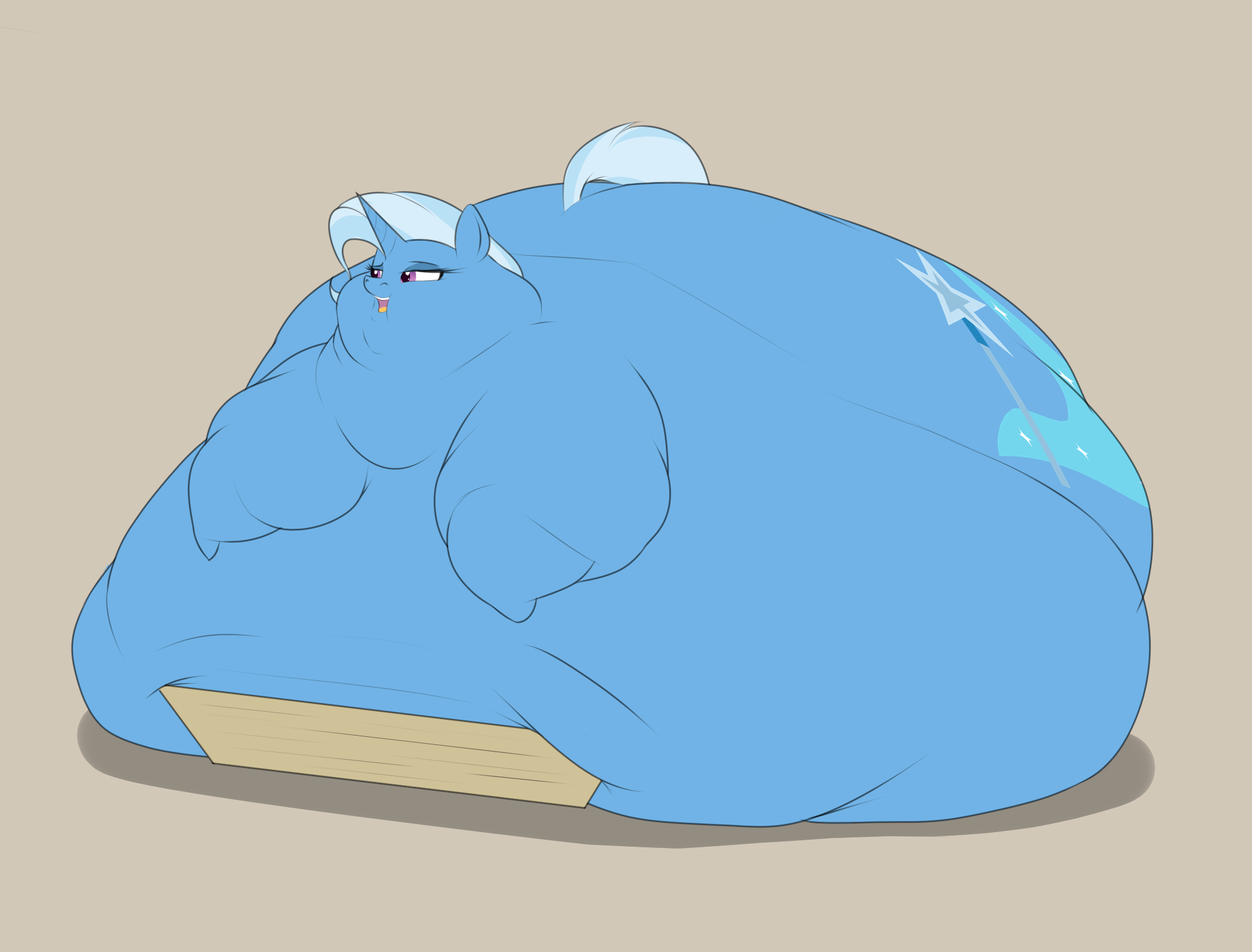 You know, the art's pretty good, but it's always going to be a pet peeve of mine when ponies fatten up like humans, with a lot of the weight going to their hips and ass. I'm not expecting 100% accuracy to what an actual IRL fat horse looks like, because of course these aren't real horses, but I would like their anatomy to be horse-esque in general, rather than somebody clearly trying to draw a human body and stick hooves and a tail on it.