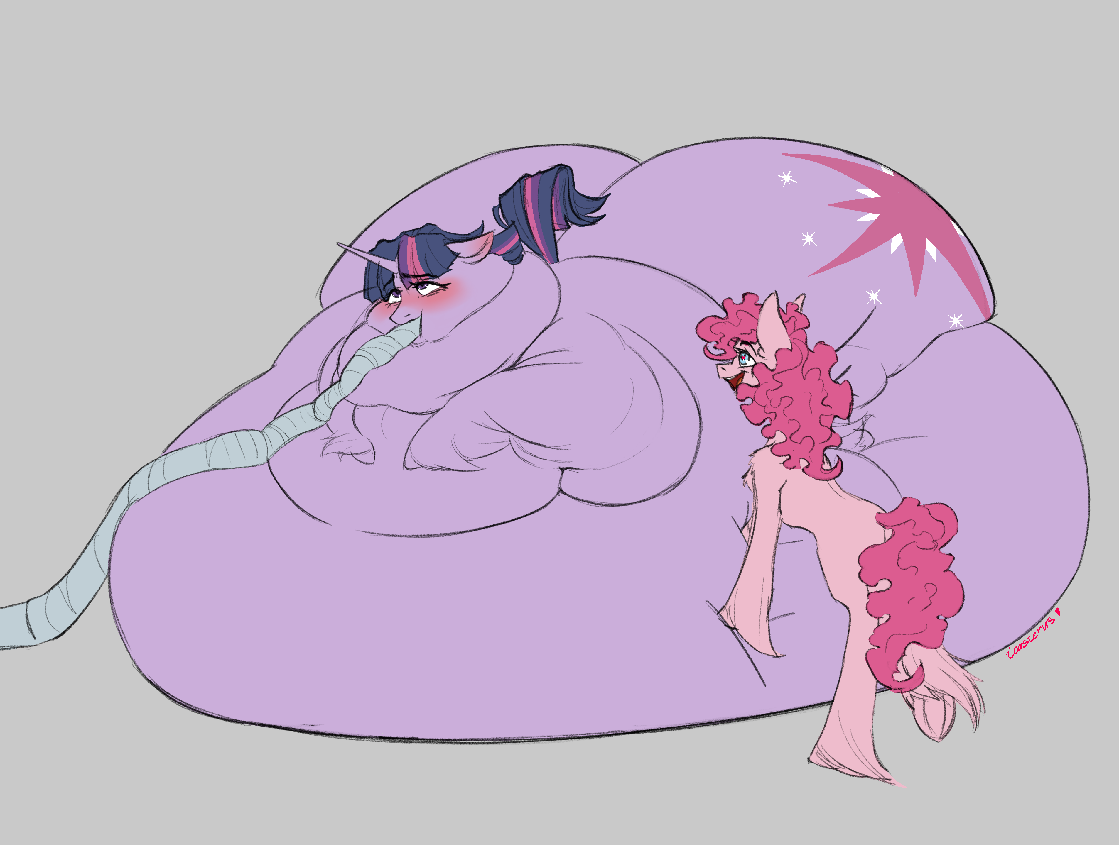 I like Fluttershy and Twilight's neurotic tendencies flaring up as they are fattened up, growing more helpless physically as their ability to stand up for themselves is whittled down from endless feeding.