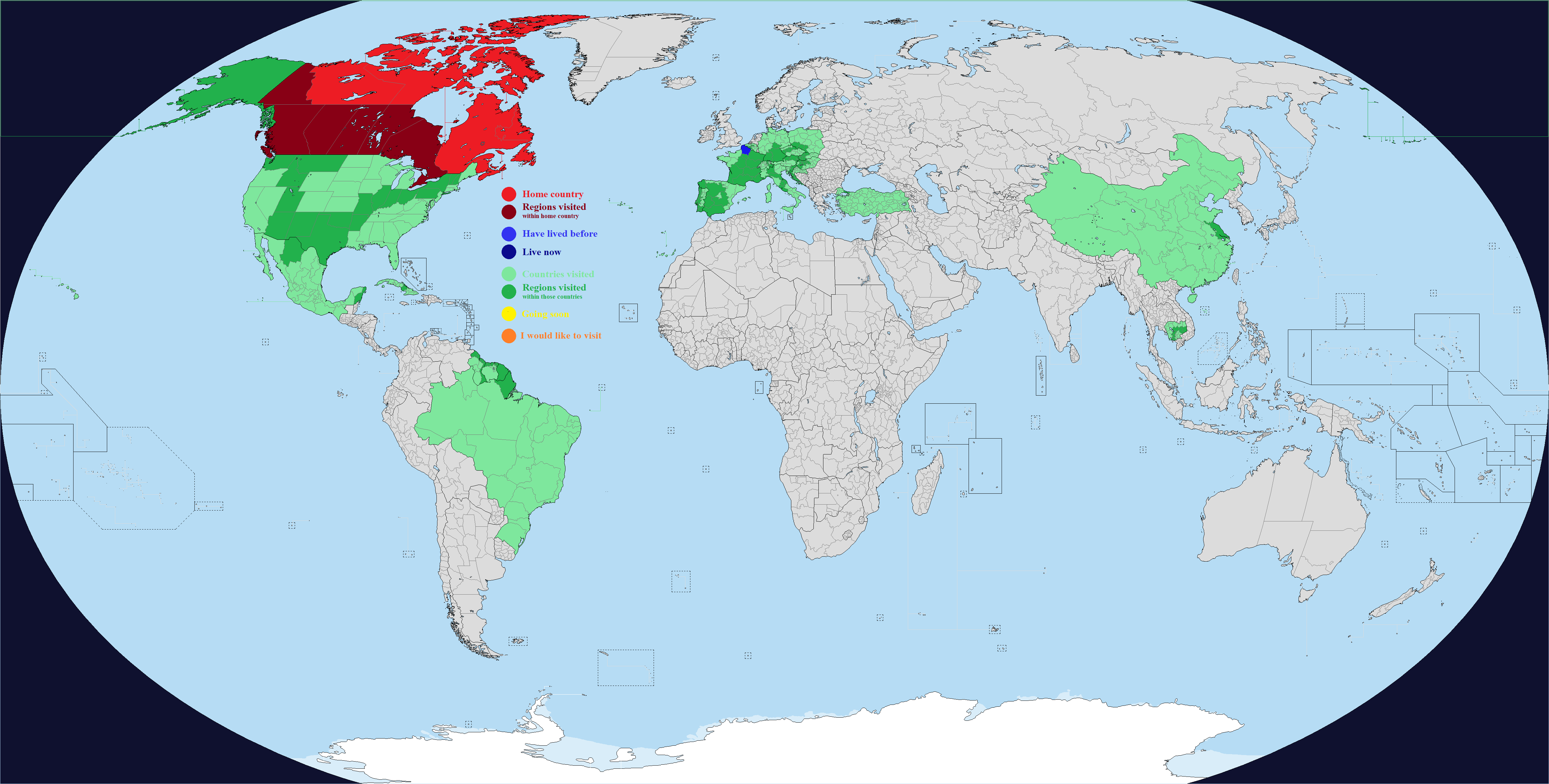 Fill in the countries and subdivisions you have visited, talk about your map and ask others about their maps. You can use the map however you like, the colors are more like suggestions, you don't have to use them, and you don't have to use all of them. You can add or remove colors and change the map as much as you want in any way you want. Don't like this map? Upload a completely different one. Up to you. Despite what some might say, there's no "wrong" way to use the map, and new posters and less travelled people are welcome and encouraged to stay and post :) This map is a group effort by our board, and we can only improve it if people reach out to share suggestions or corrections.