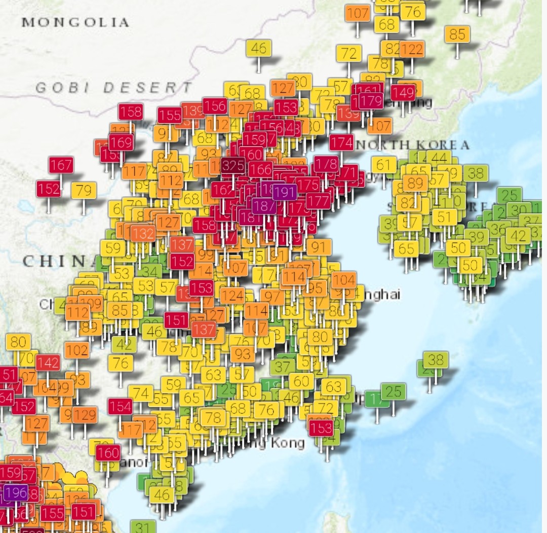Current AQI map of America btw. National parks are clean but everything else is hazardous and far above the "poor air quality" you claim Chongqing has of 120.