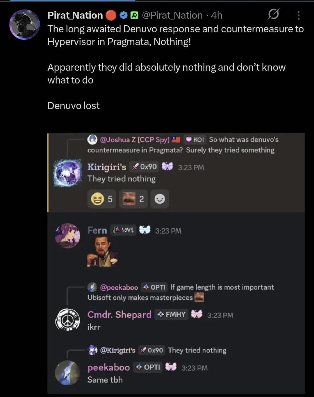 either way though, paypigs LOST. pirates get the better version of the game, with more frames, and EARLIER than paypigs. this has been denuvo's and paypig's longest humiliation ritual