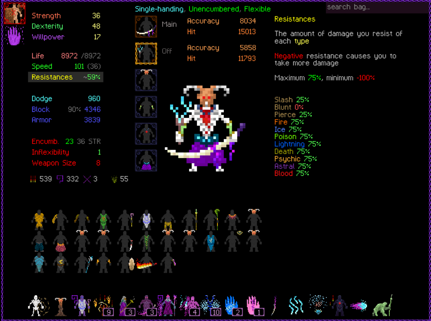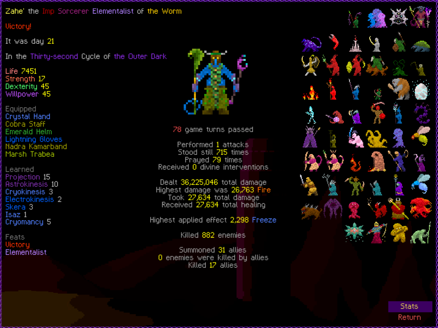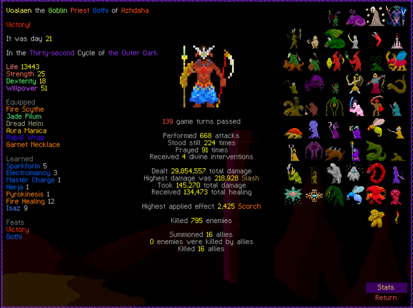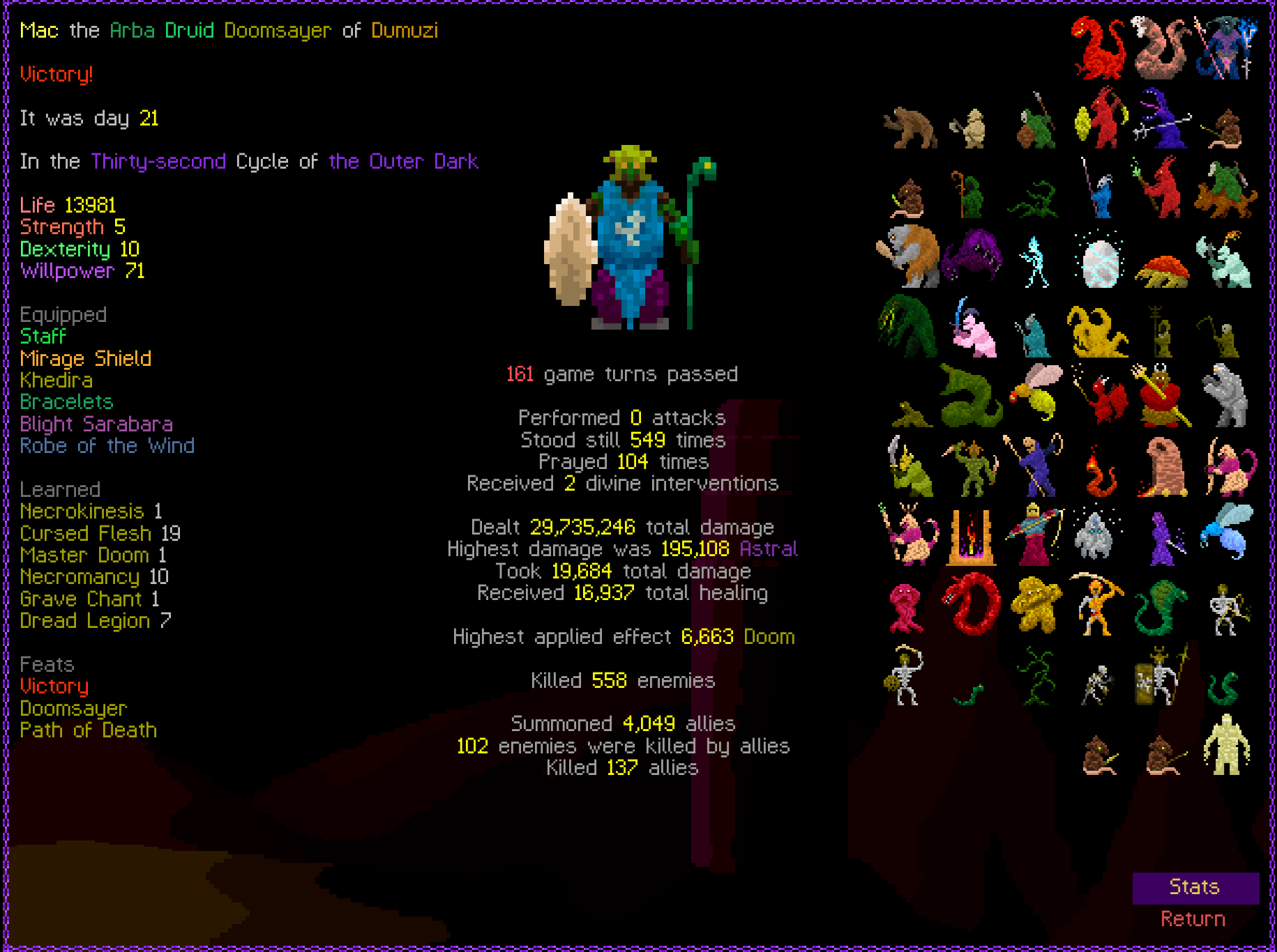 I decided to do it with only Death Powers for the Path of Death achievement which I apparently didn't already have. It's just a pure summoner build and I didn't even get great weapons. You can improve it with stuff like Projection from Astral and Plague Chant from Poison and grab other summons but it's not necessary, it scales well with just dumping Cursed Flesh. Dumuzi lets you dump 9 prayers per floor without losing resources and there's synergy with Master Doom giving armor which improves the damage of Prayer 3 which might be worth putting more points into.