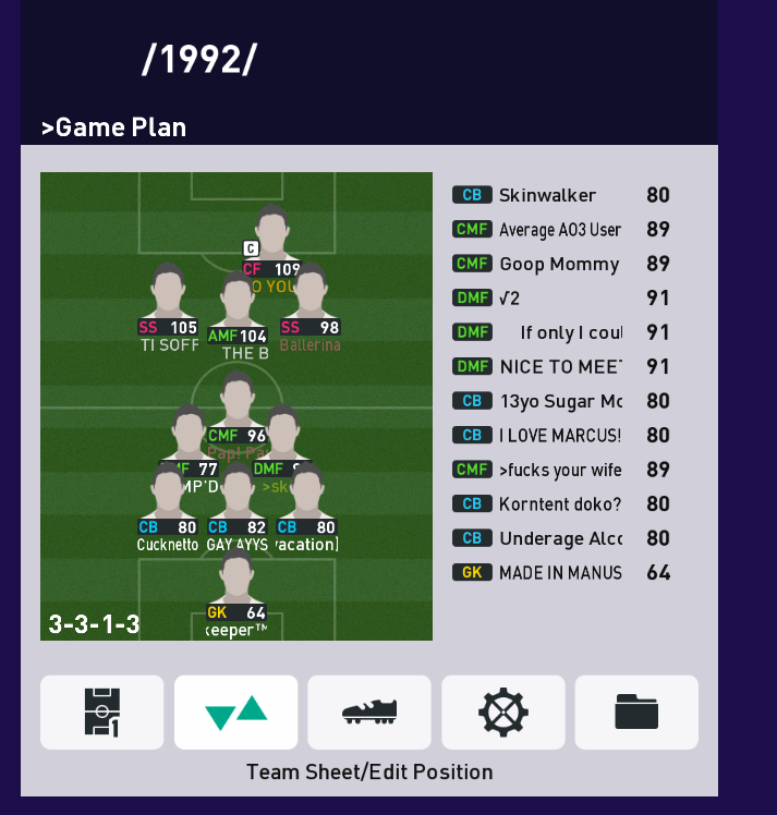 Put simply, a simulation of Pro Evolution Soccer being competed between teams which are embodiments of boards of the 4chan imageboard. The players represent facets of each board's culture. All of the matches are AI versus AI. However, humans "manage" each team, creating their tactics and giving input during games as they happen to make substitutions and tactical changes as they see fit.