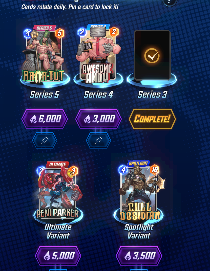 Cards unlock in a random order, but specific cards are unlocked within specific collection level (CL) ranges: Series 1 cards (CL 18-214), Series 2 (222-474), and Series 3 (474+). Series 4 (Rare) and 5 (Super Rare) cards can be purchased directly with Collector’s Tokens that can also be used to buy Series 4 or 5 Snap Packs that are cheaper but dole out random cards from certain pools.