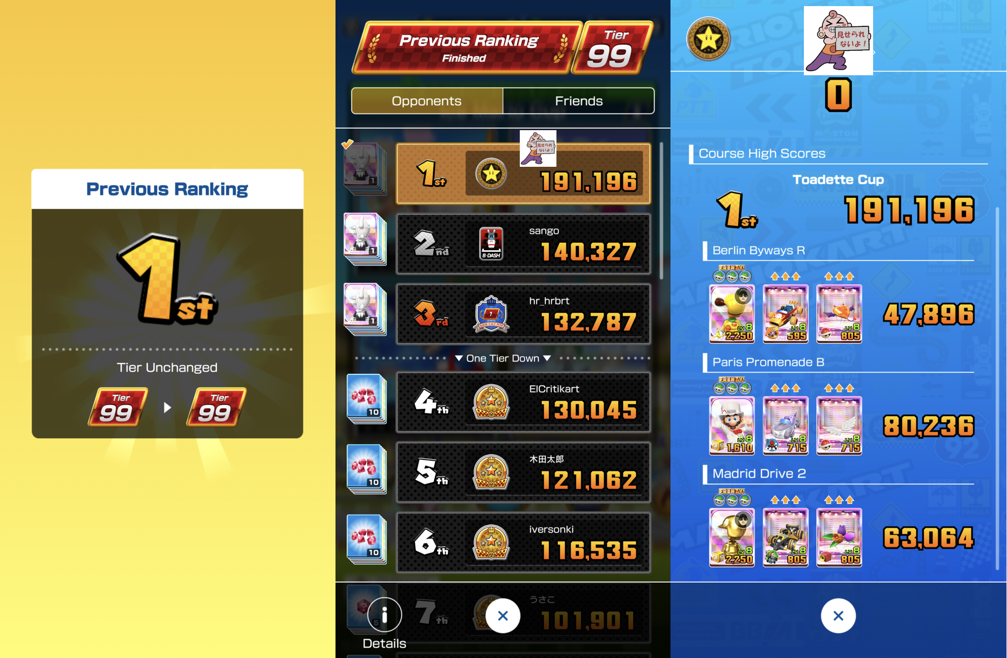 I might need to level up my Thai Daisy (Lv7/3c) to raise my score on Bangkok 3N if I am passed again. Or I could quad cap the Gold Comet kart (Lv8/3c).