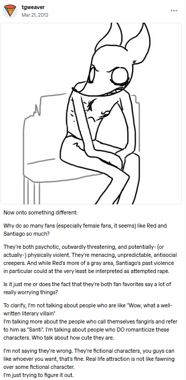 I'm surprised how much I started liking Luzma though, at first I just liked that laughing detail, but the more I thought about her, the more I started to really, really like her. She doesn't have admin access over my entire brain like Ceroba does or anything, but I've been passively coming up with tons of ideas for her, a lot of them not even being super specifically weird or freaky, like my first two were for her.