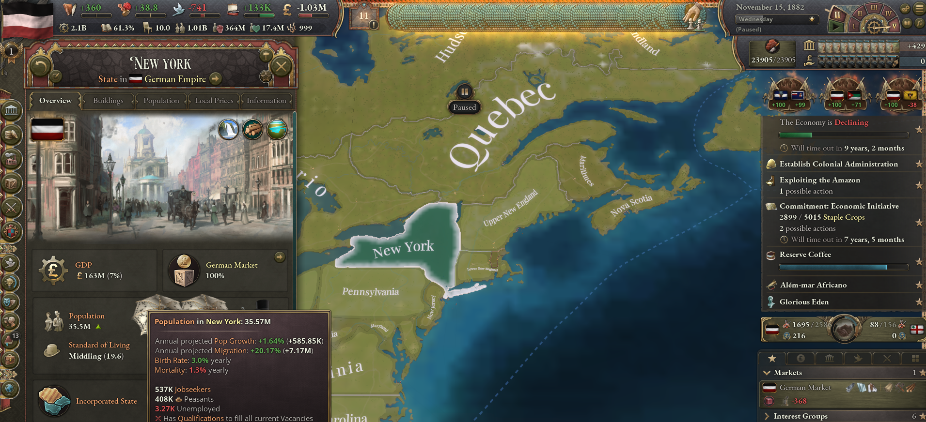 Going for Gross Germanium world conquest, trying to get as many Germans as possible through assimilation. It's still only 1882 but I already have 126 million Germans, for comparison there's only 450 million Chinese in the world.