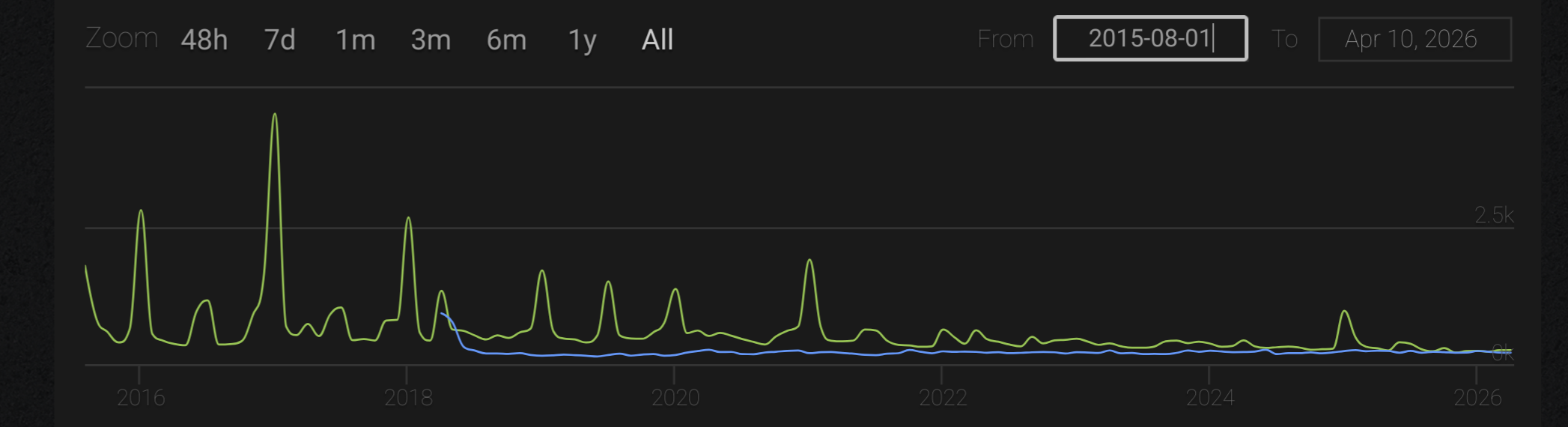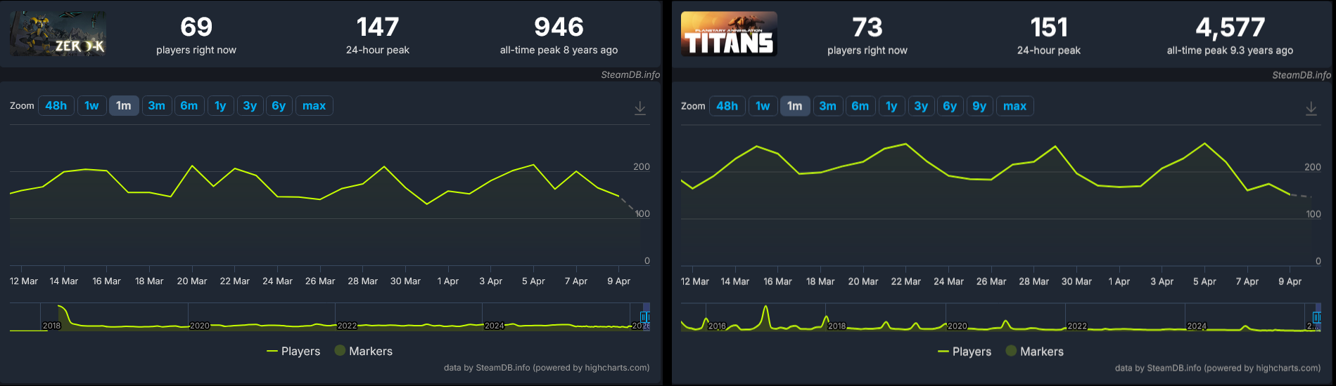 Zero-K had a peak then stayed the same throughout the years. Planetary Annihilation Titans has been trending down throughout the years. PA is a dying game. Zero-K will live forever.