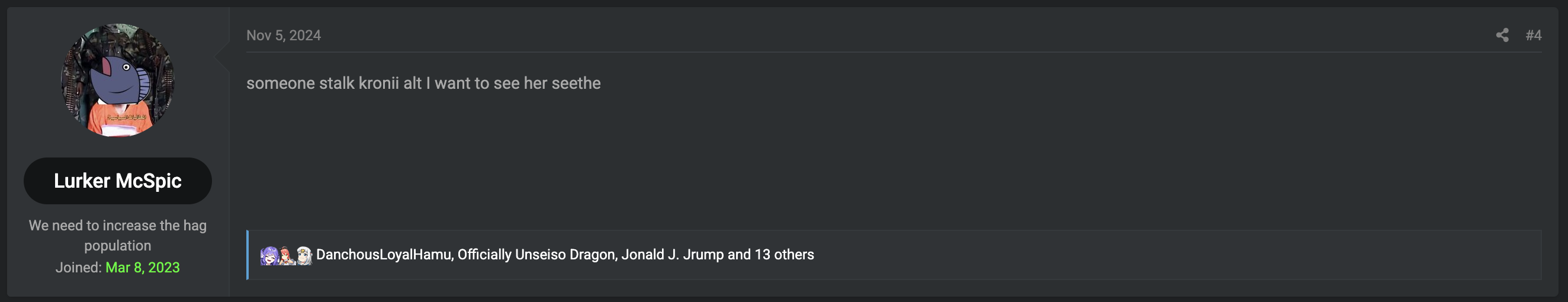This is just what happens when you let dumb right leaning tards congregate. Normally they turn on each other but this is what the girls are for. Since the girls don't actually interact with them. The chud thinks she's on their side. A child who feels emboldened by imaginary pussy will say and do wild things that they normally would be too ashamed to but the mere IDEA that a woman agrees with them makes them believe they are embodiments of God.