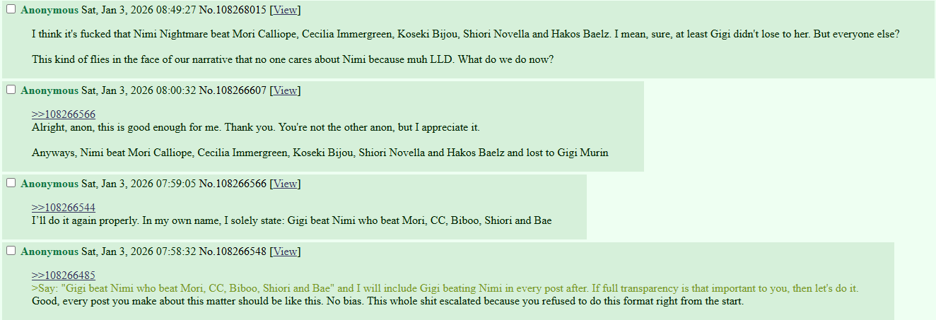 He'll try to ignore this because it means Nimi lost to SIX Holomems and their Unique Members cope just got trashed by Biboo >>111122574 , he can't accept that Nimi got utterly defeated.