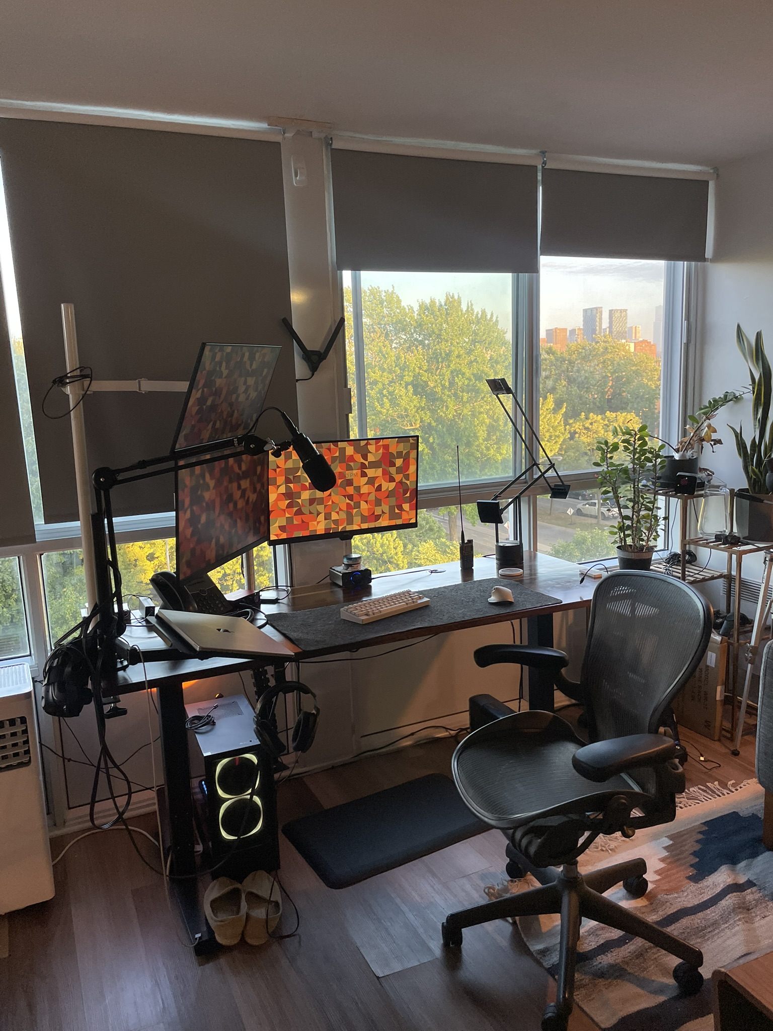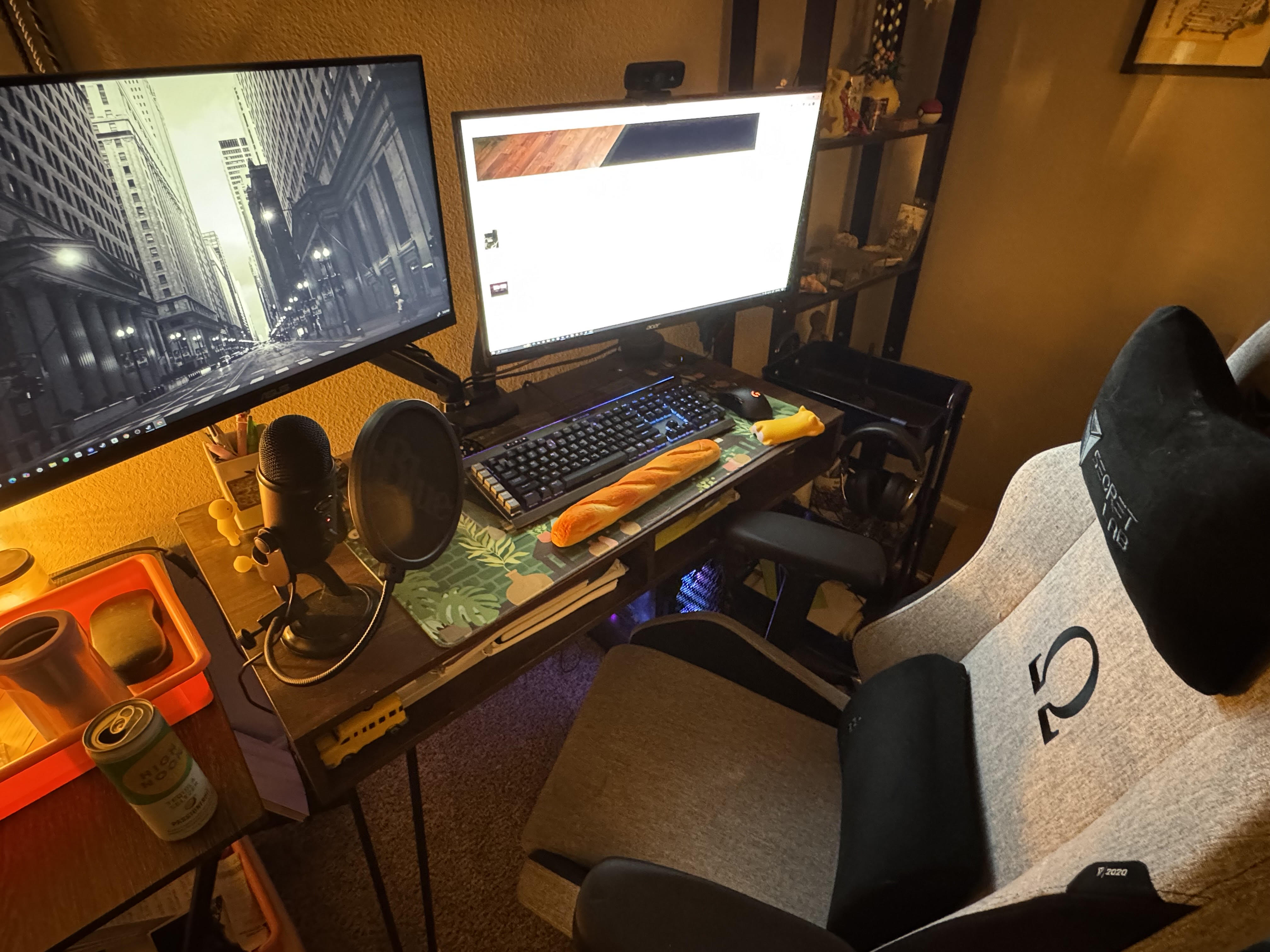 Current setup is this, but with the tower now on a tall wireframe rack. Spacemaxxing in an apartment with a new baby. I also have a 19" portrait mode monitor to the left of the main monitor. main is a 32" 16:10 2560x1440 which is just plain lovely for productivity, and I do a lot of PCB design so it works out better than a typical widescreen. Plus- it was free from the e-waste at work.