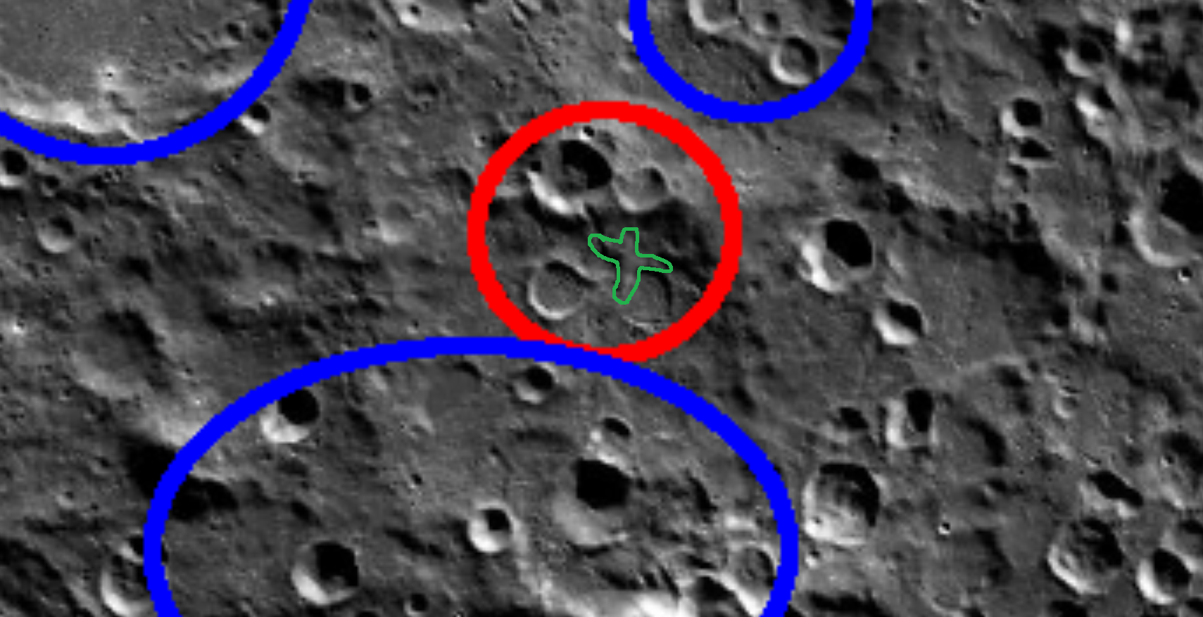 dunno what you see in that circle, but there's a moonjeet in the upper right hand corner ... can miss him ... and what appears to be construction equip or something in the large, extremely round crater not far below your circle. Also an odd zipper looking construction that doesn't look natural.