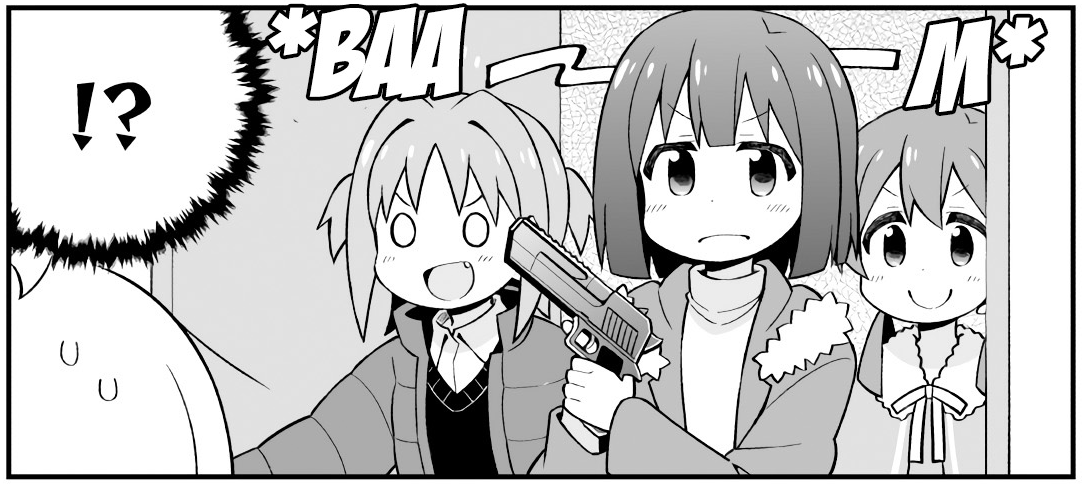 Good thing Yuuta is holding the trigger, Mahiro and Minato are prone to negligent discharges