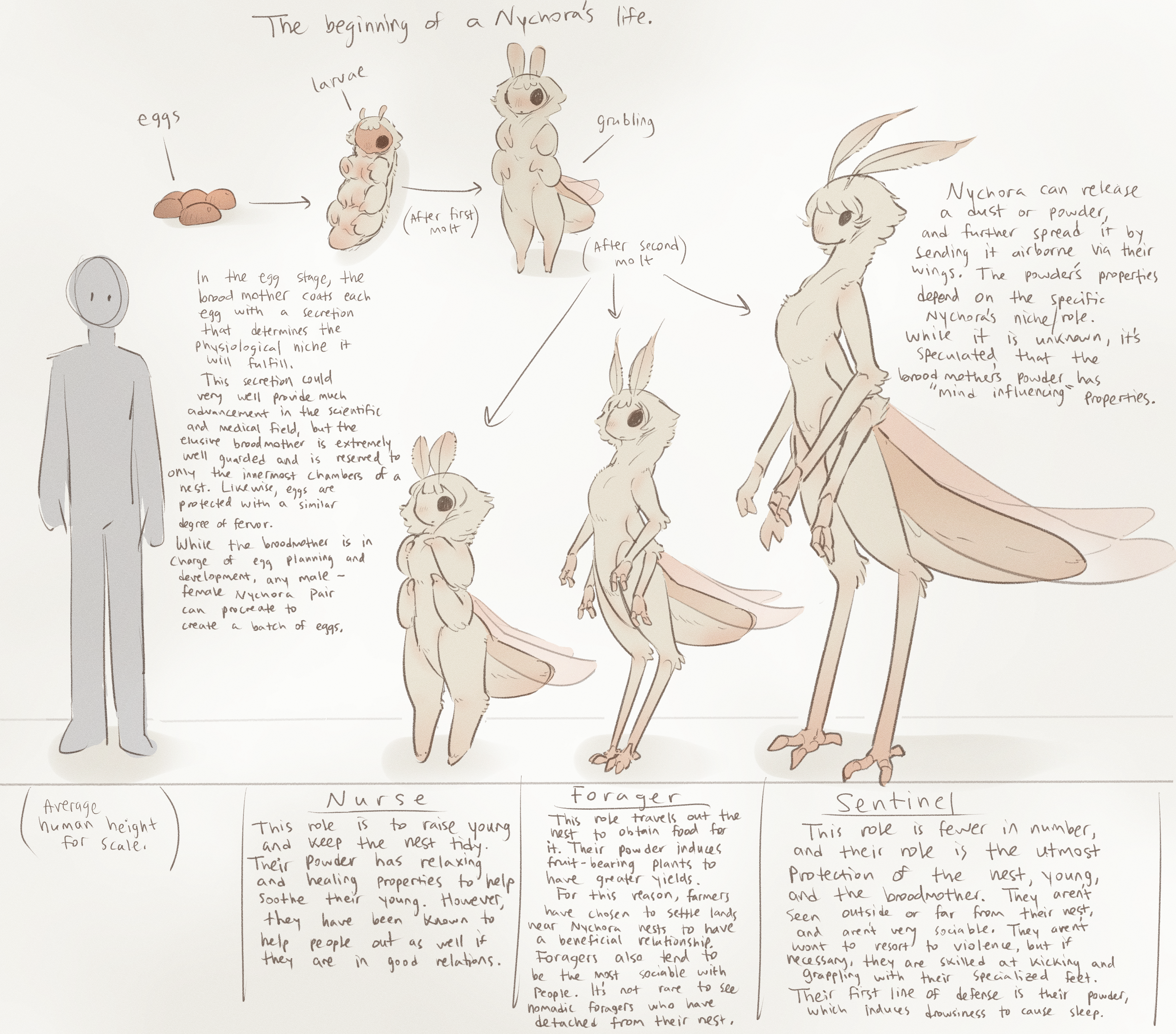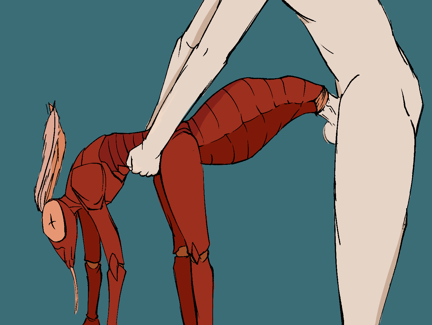 Well I feel like I've ticked something off of my bucket list, getting someone to draw lewd fanart of a SFW story. I think that Fyrix is a little bigger than canon, but the pose is amazing. I love how they're just hanging there like a cat and easy enough to free hand. Then there's the skin around the abdominal opening, and the hint of a bulge underneath the chitin. The way that it already looks at its absolute limit is great too. I can only imagine the smells they're putting off.
