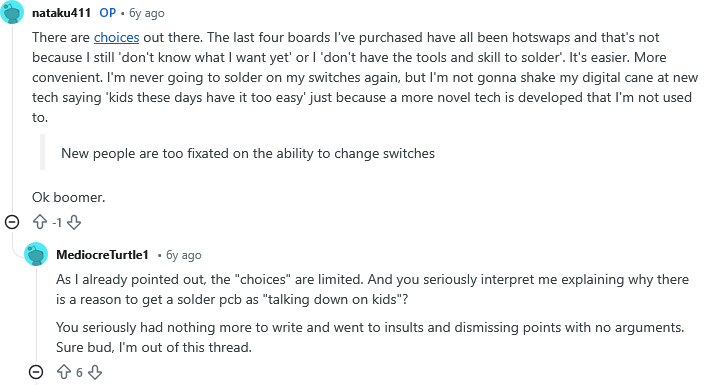 Other than that, there are plenty of Redragon options locally, some costing less than $30, which I could use for hot swapping modding purposes, but I read that they all use Outemu switches which are supposedly terrible and their boards not very widely compatible with modding (I'd need to destroy the entire fucking gateron switch just to make it fit)