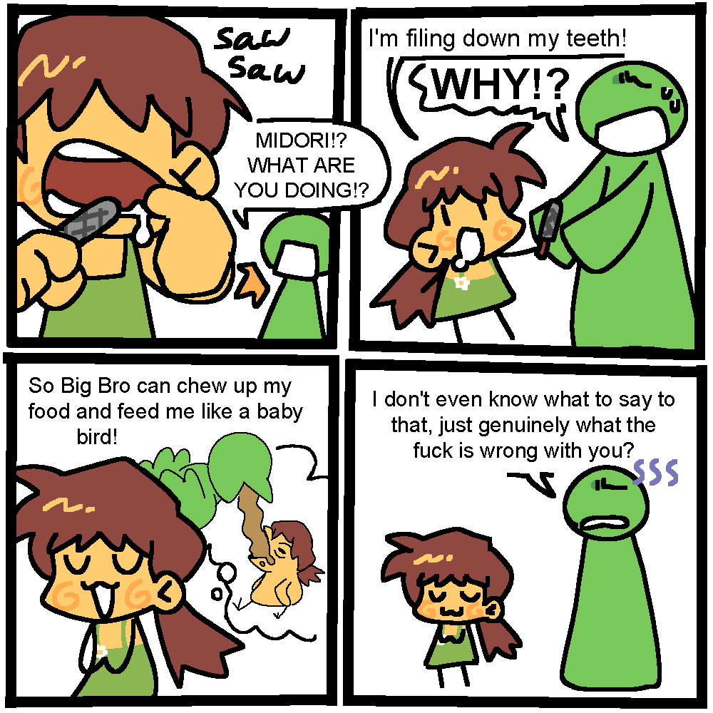 I fear for big bro's life with every comic issue only adding fuel to midori's power level, next thing she'll be able to do is make big bro love her unconditionably which tricot's brother could only dream of experiencing.