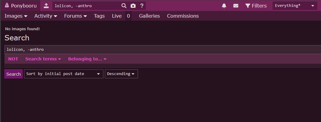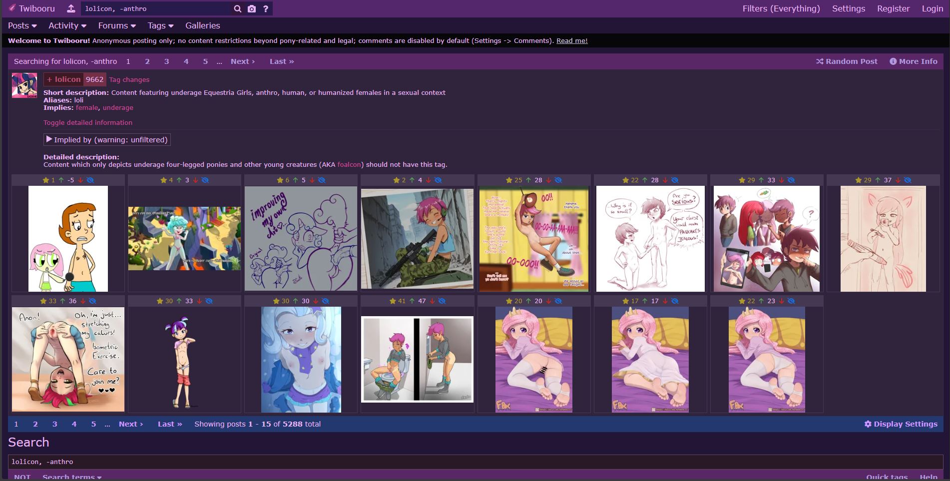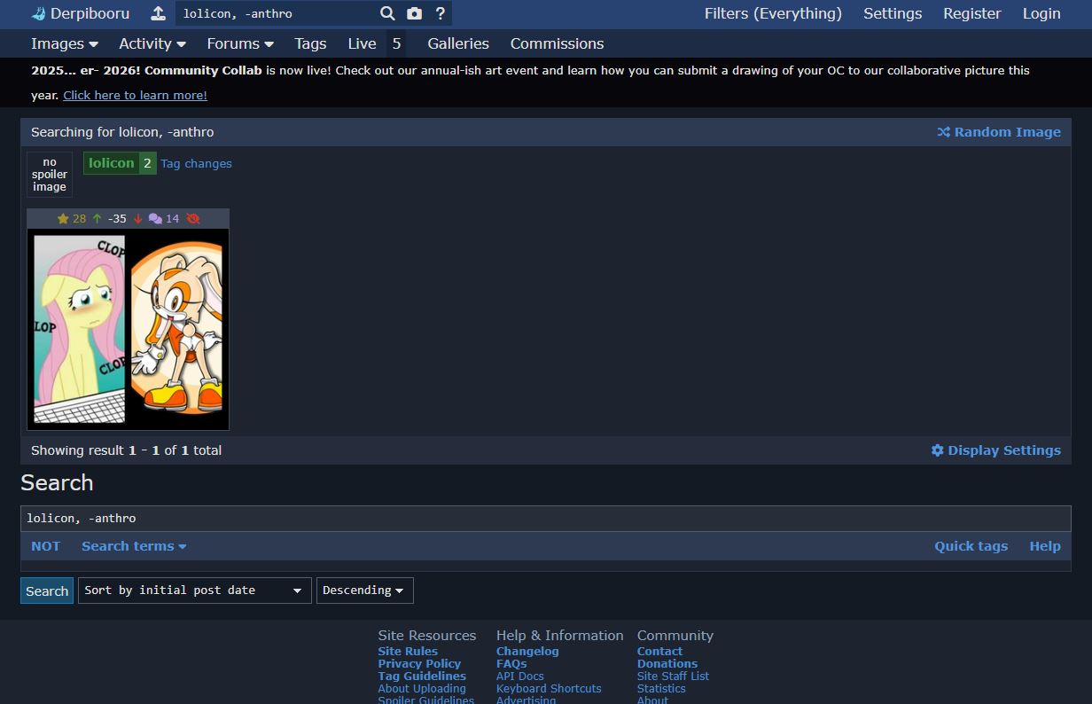 As an example, here is a search for "lolicon, -anthro" on derpibooru. This is with filters set to "everyting," ie no content filters whatsoever are being applied: