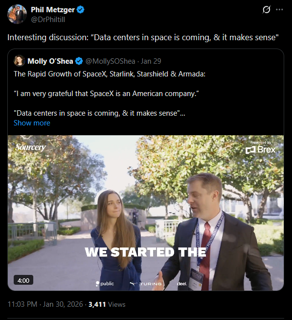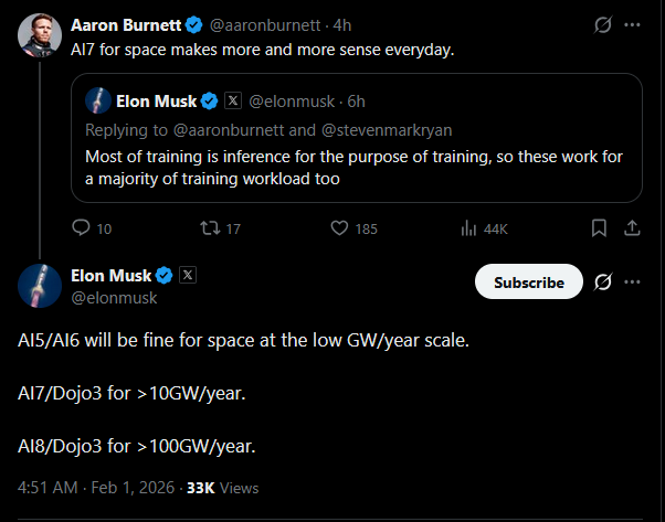 And further more, I think Musk has plans for lunar and Mars base as a mechanism to counter the limitations of the launch rate on Earth themselves should Earth gov prove to be hostile to launches. So they will launch from the moon for their realized dream of millions of satellites in space each carrying Tesla chip for AI training and inference using the sun as the constant free power source.