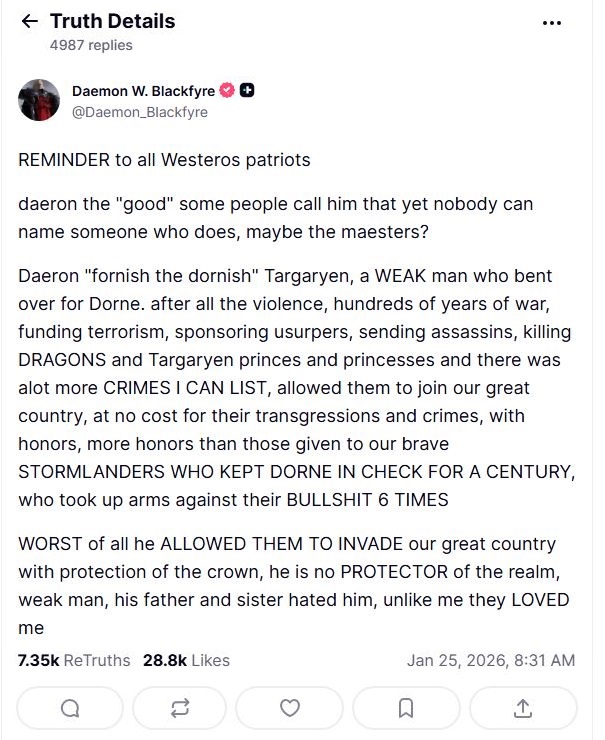 being dressed as a northerner and asking for the protection of the seven is perfectly in character, like how Hegseth LARPs as a Crusader despite belonging to an evangelical church whose pastor says in his ideal country practicing Catholicism would be illegal