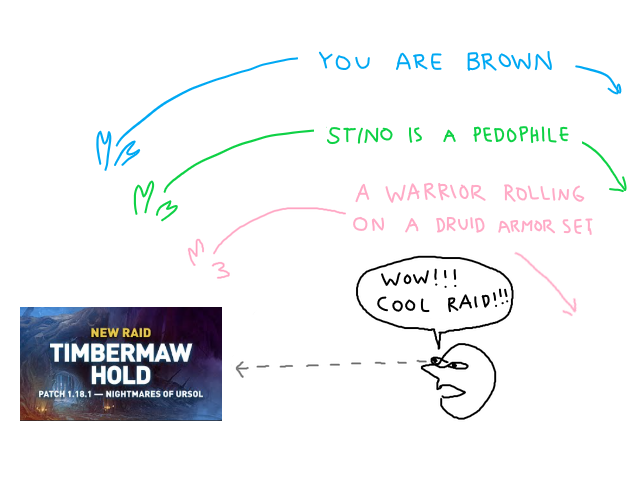 The green line/path "STINO IS A PEDOPHILE" is a very direct (and extremely online/offensive) reference to some kind of long-running community drama or accusation against a player/figure named Stino (or Sti/no — possibly a raider, streamer, or notable person in Turtle WoW circles). This is the "mean" part of the meme — throwing in a serious/grim accusation as a shitpost punchline, which is common in toxic wow private server memes.