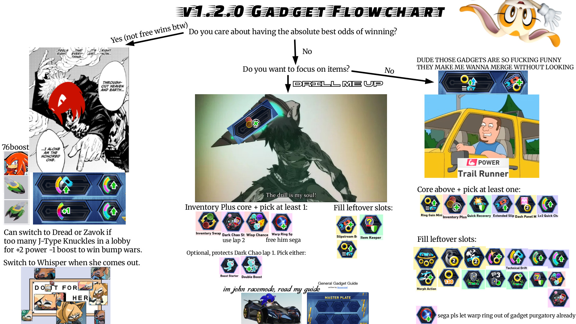 Would be nice if this had a toggle for gadgets like Wisp Chance Up too. At a glance I think I still made the right call in dropping that. When Laser's in the pool, I'd rather have most of the other available items than a rate up on Void (and sometimes Boost) Wisp. Not getting Drill in 9th-12th is more likely to be from possession limit than roll odds. In 1st it means more Bomb and less Tornado/Shield/Omochao.