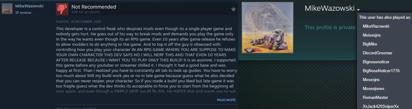 What boggles the mind is that other devs like the Iron Tower folks correctly identified the core issue of single player RPGs that force specialization, which is the need for tailor made content that caters to specific character archetype and directly funnels them into specific content routes, even if it wasn't done well they still fundamentally understood the intrinsic needs of the formula they wanted to make, in well over a decade it's clear Styg not only didn't get this dilemma, he clearly suffers from massive cognitive dissonance on top of an overly inflated ego.